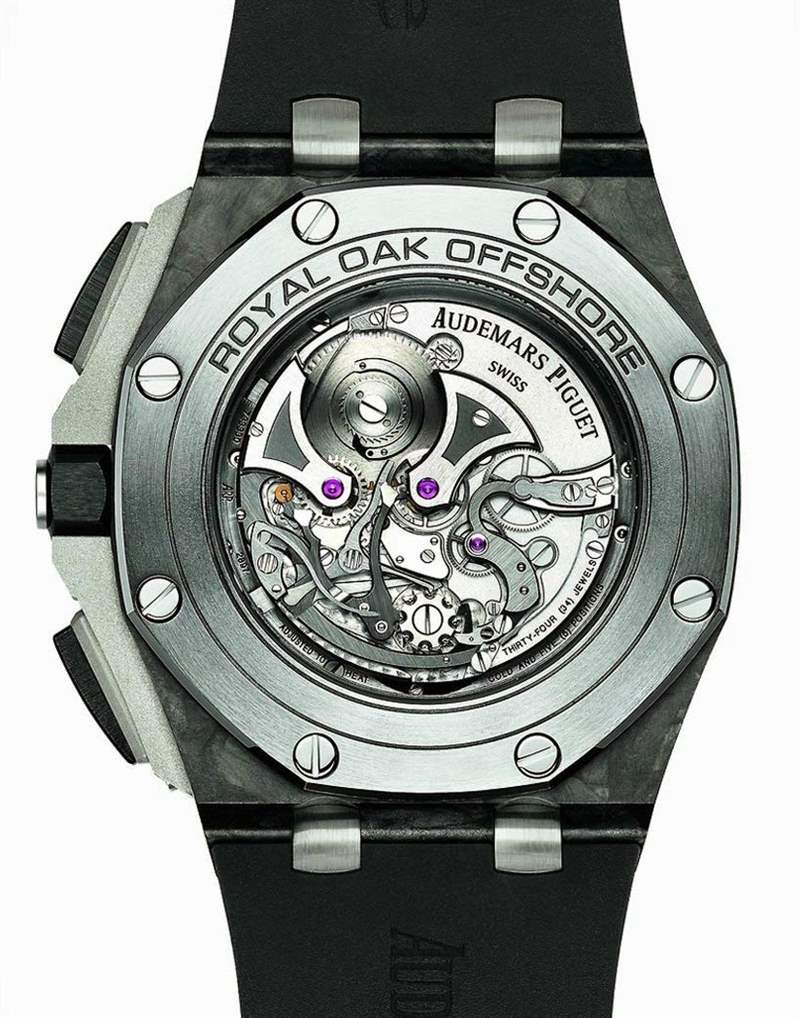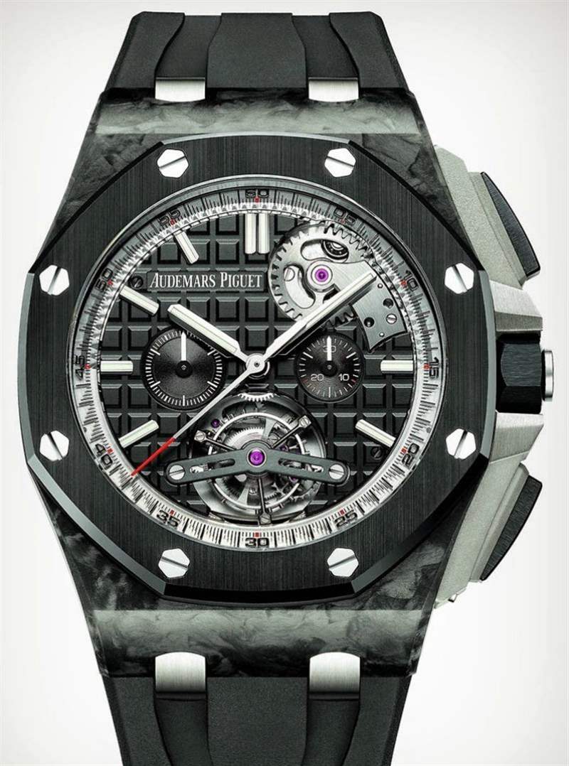 與大多數這種風格的愛彼皇家橡樹離岸型手表一樣,愛彼皇家橡樹離岸型自動上鏈陀飛輪計時碼表采用 44 毫米寬的表殼,由黑色陶瓷、鍛造碳和鈦制成。它具有非常運動的外觀,但佩戴者可能會欣賞內部機芯的精致精致。
