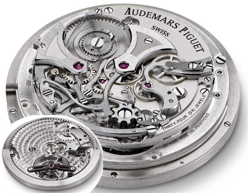 外圍自動轉子不位于機芯之上,而是圍繞在機芯周圍。通常有一個新月形的重物沿著軌道移動,作為轉子。Carl F. Bucherer A1000(以及其他帶有后置外圍轉子的機芯)等機芯就是這樣。在像愛彼皇家橡樹離岸型自動上鏈陀飛輪計時碼表這樣的手表中,外圍自動轉子實際上安裝在機芯的頂部,在這種情況下,可以通過手表的表盤看到。在這款時計中,轉子必須足夠重才能為機芯正確上弦,因此 Audemars Piguet 和 Renaud & Papi(機芯的生產地)用鉑金打造了外圍轉子。