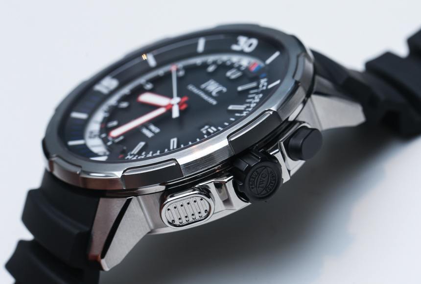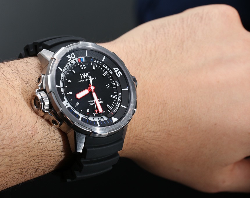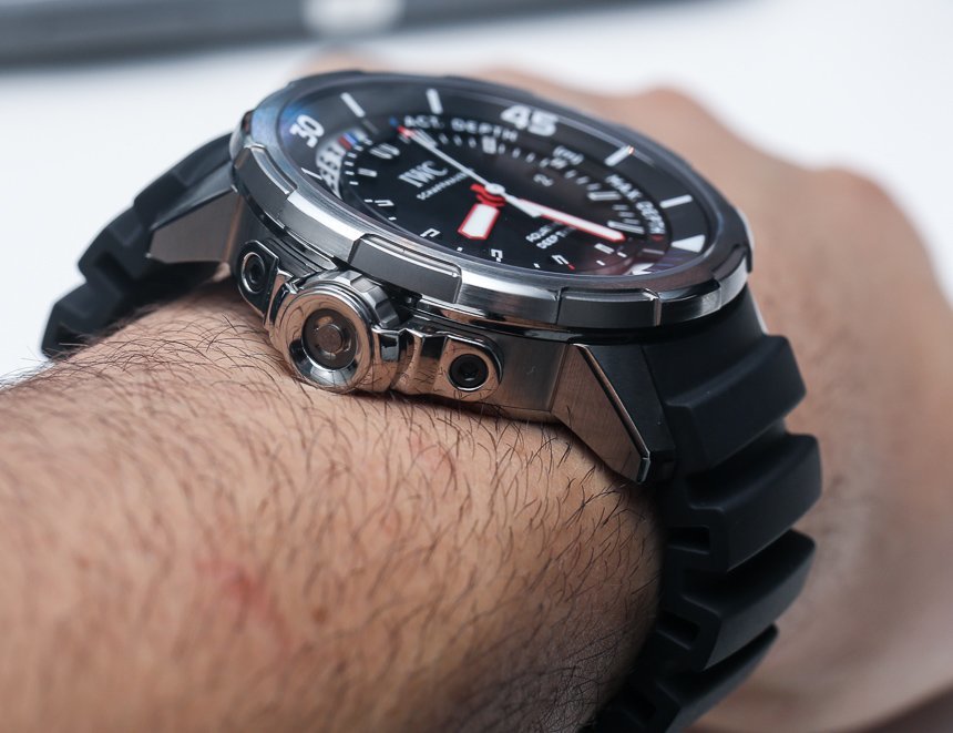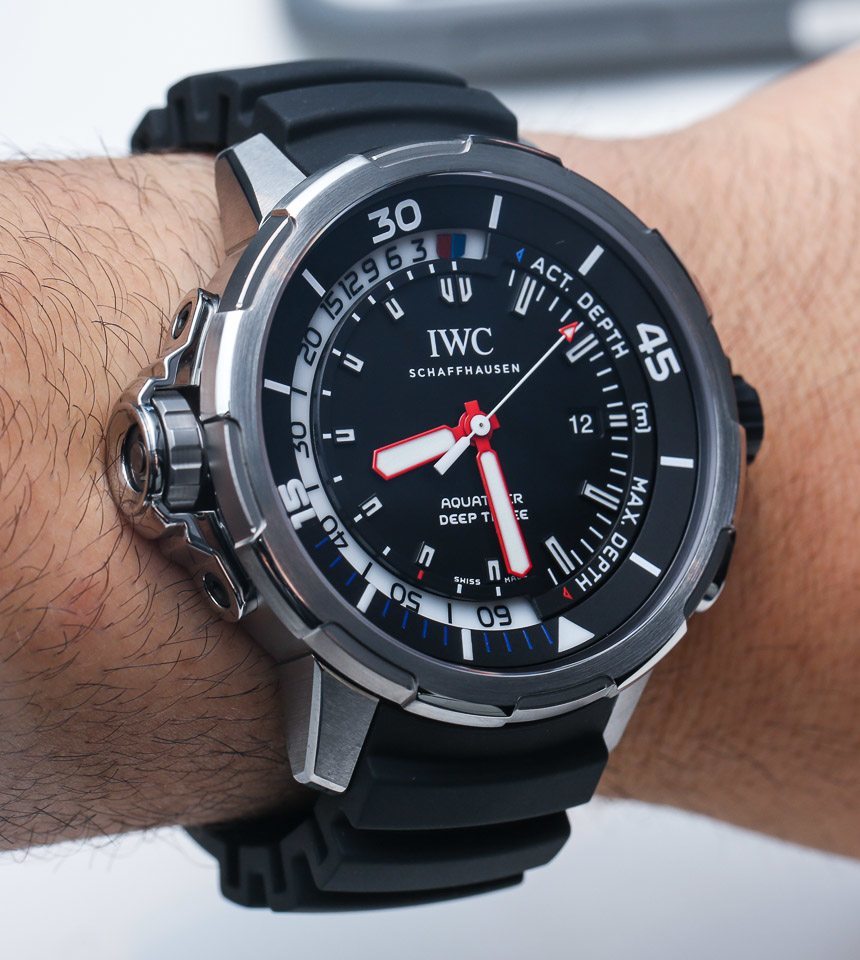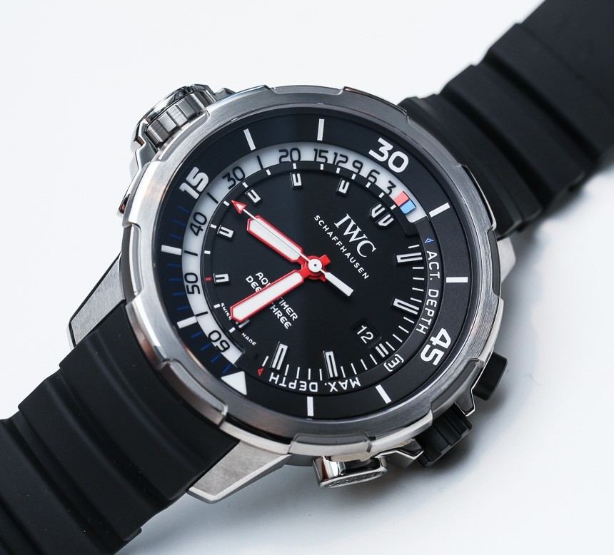 IWC萬國表Aquatimer Deep Three的表殼材質(zhì)采用鈦金屬。它當(dāng)然具有我們喜愛的海洋時計系列的酷炫新功能。我要再說一次,“SafeDive”棘輪旋轉(zhuǎn)潛水表圈系統(tǒng)非常棒,表帶的快速釋放系統(tǒng)也非常出色。