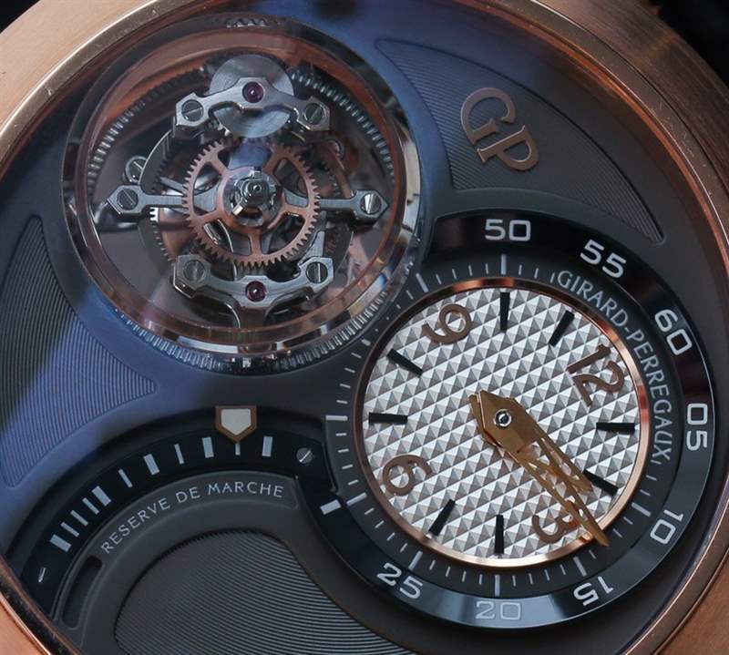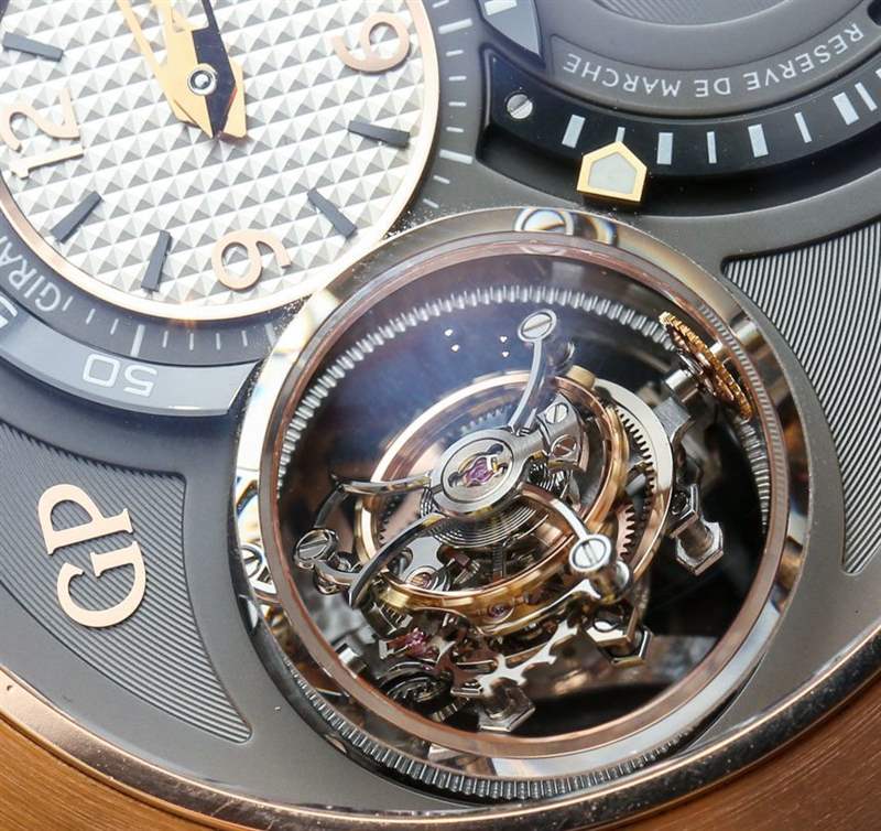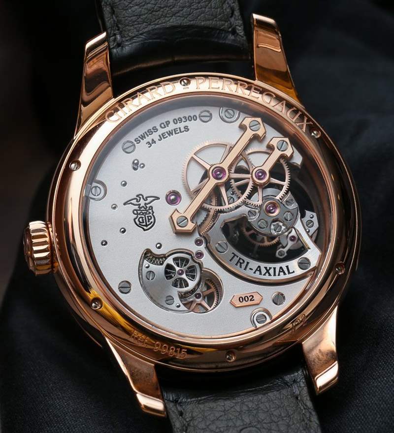 具有多個軸點的陀飛輪的生產(chǎn)和設(shè)計特別困難,因為陀飛輪中有陀飛輪。Girard-Perregaux 三軸陀飛輪由中央一分鐘(60 秒)陀飛輪、中間 30 秒陀飛輪和外部 2 分鐘(120 秒)陀飛輪組成。這意味著每個軸點以不同的速率旋轉(zhuǎn),視覺效果非常令人印象深刻。還有令人難以置信的小零件密度。