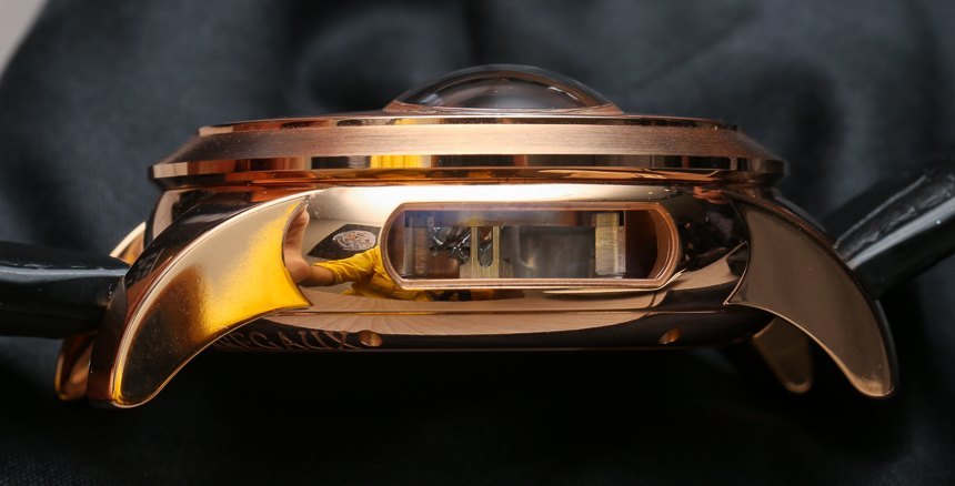 該機芯具有偏心時間表盤,以及方便的動力儲存指示器。當然,還有陀飛輪的大開窗,藍寶石水晶玻璃中有一個氣泡為其騰出空間。如今,水晶中的這種“氣泡”越來越容易被接受。也許真力時首先在最初的零重力陀飛輪中引入了它們,后來變成了Christophe Colomb 系列。其他品牌,如海瑞溫斯頓,也在水晶中使用氣泡來為復(fù)雜的陀飛輪復(fù)雜功能騰出空間。