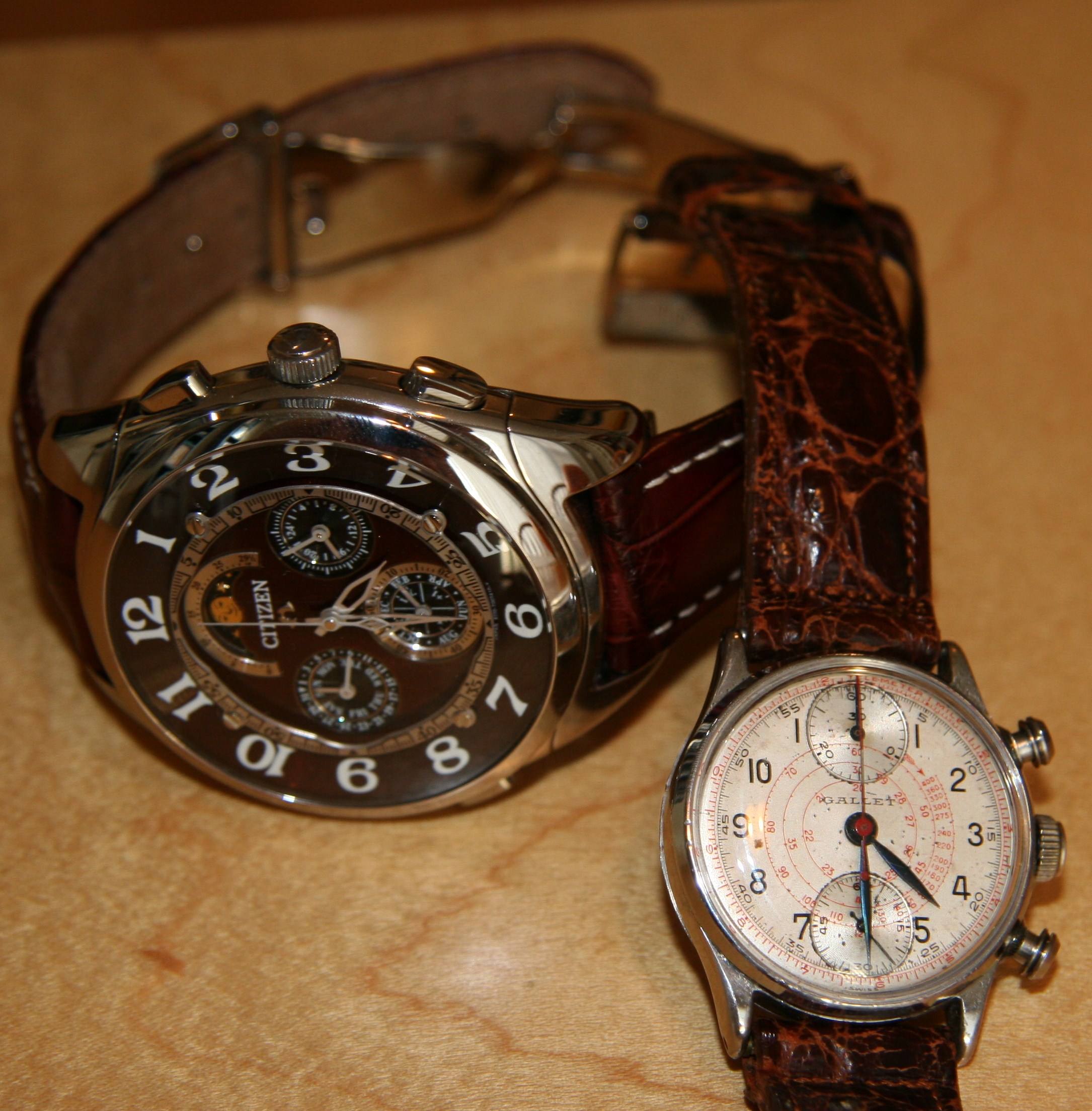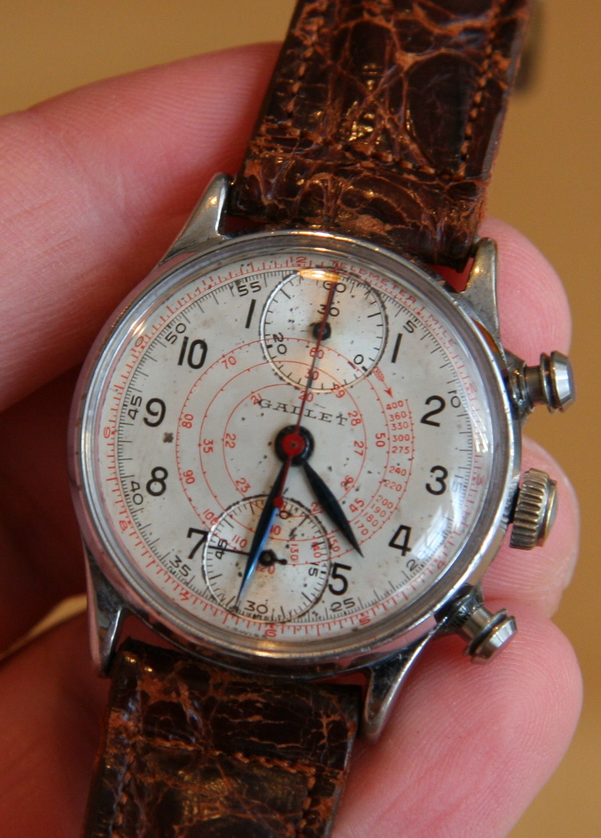 我的實(shí)驗(yàn)標(biāo)本是剛修復(fù)的Gallet。我對(duì)手表了解不多,因?yàn)樗浅:币?jiàn)。但我可以估計(jì)它很可能是在 1940 年代初至中期(可能是 1930 年代)制造的。這只手表是我的祖父,當(dāng)我得到它時(shí),它年久失修(無(wú)法工作,缺少水晶,劇烈氧化)。它現(xiàn)在又起作用了,在我的手腕上。修復(fù)過(guò)程的細(xì)節(jié)我就不多說(shuō)了,但是由于找零件的困難,這個(gè)修復(fù)項(xiàng)目遠(yuǎn)遠(yuǎn)超出了常規(guī),花了大約一年的時(shí)間坐在那里等待零件。我大部分原創(chuàng)的Gallet以一種令人印象深刻的但明顯的復(fù)古狀態(tài)回到了我身邊。我遠(yuǎn)離古董這個(gè)詞,因?yàn)檫@意味著過(guò)時(shí),而這里的情況并非如此。人們可以買到一款完美的現(xiàn)代手表,其機(jī)芯和功能與這款小Gallet相似。