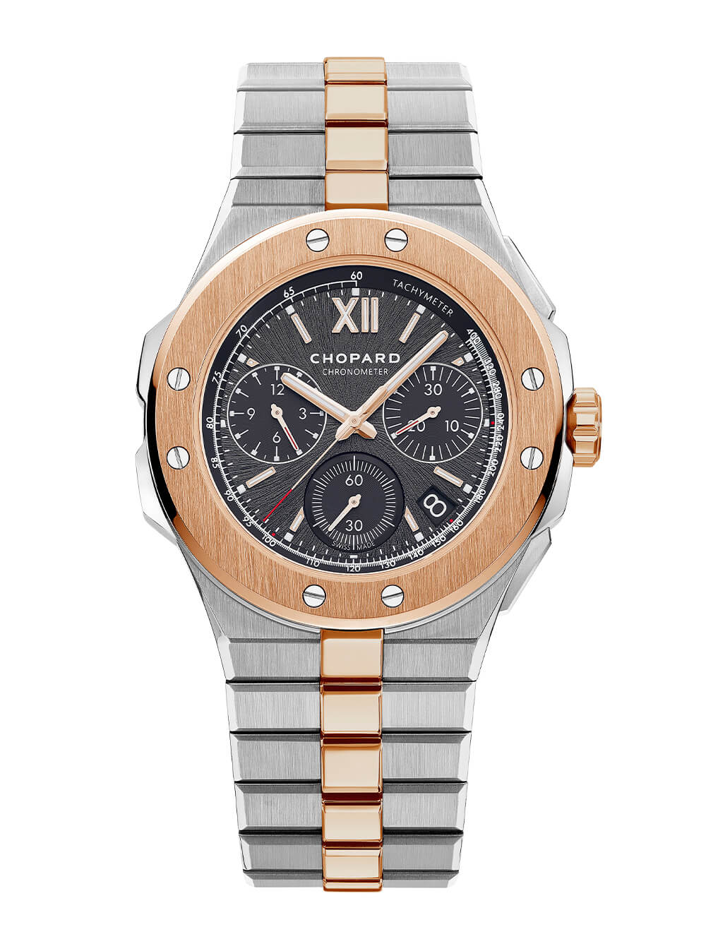 Alpine Eagle XL Chrono 增加了一個飛返計時碼表,該計時碼表由 Chopard 完全內部 03.05-C COSC 認證的自動導柱輪計時碼表機芯提供,該機芯擁有 60 小時的動力儲存,并已在 Chopard 的運動型 Mille Miglia 計時碼表中證明了自己。
