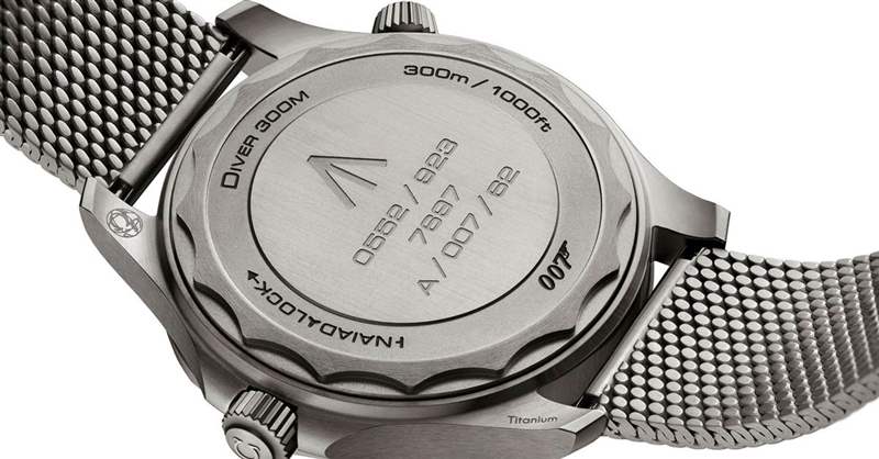 您會在表殼背面找到特殊的雕刻和銘文,其中包括帶槍的 007 標志以及在啞光熱帶棕色鋁制表盤 6 點鐘位置也可以找到的向上箭頭。這款表背的一大優點是它具有 NAIAD 鎖定系統,可將表背及其雕刻與手表的方向對齊。