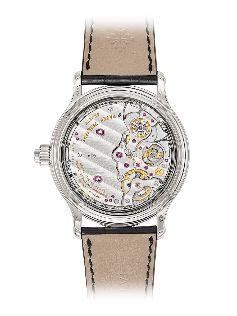 機(jī)芯: Calibre GS 36-750 PS IRM,37mm x 7.5mm,手動(dòng)上鏈,95 顆寶石,703 個(gè)零件,百達(dá)翡麗印章 頻率: 25,200 vph (3.5 Hz)動(dòng)力儲(chǔ)存: 72 小時(shí)(機(jī)芯),24 小時(shí)(罷工)功能: