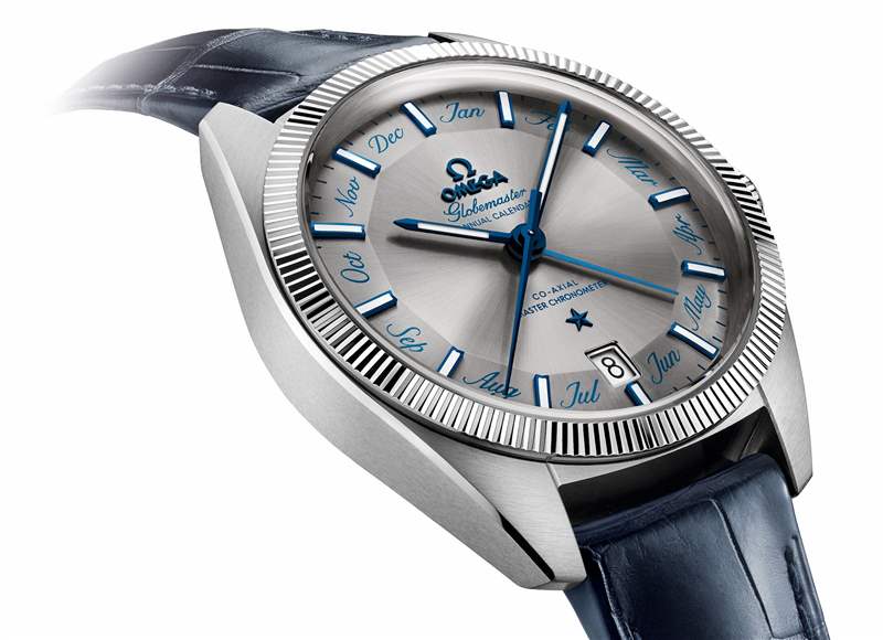 最為獨特的或許是星座系列旗下尊霸41毫米至臻天文臺年歷腕表。其太陽射線打磨灰色「派盤」表盤令人聯想到1952年首款星座腕表。表盤上每一個刻面都標記月份名稱,成為年歷指示功能的組成部分,以藍鋼指針指示月份。此外,其日歷也十分特別地被安排在了6點位上,同樣清晰易讀。搭配藍色皮表帶,低調而文雅。