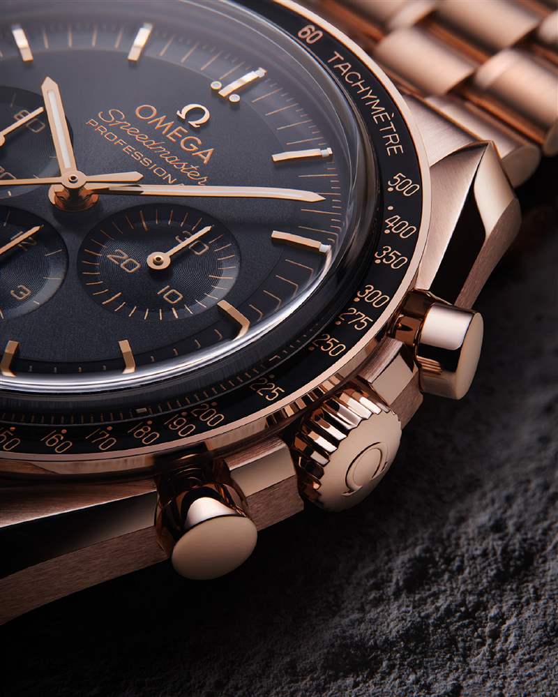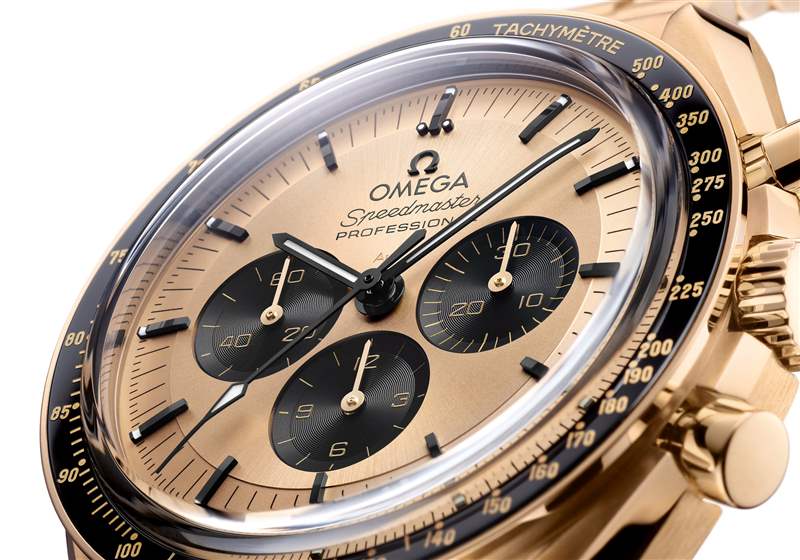 Moonshine 18K金表殼搭配 Moonshine 18K金表鏈42毫米至臻天文臺專業(yè)月球計(jì)時(shí)表:階梯式表盤,呈現(xiàn)出太陽射線的打磨效果,其上設(shè)有經(jīng)黑化處理的小表盤和小時(shí)刻度。黑色陶瓷表圈飾以由 OMEGA Ceragold 技術(shù)制成的測速刻度,并設(shè)有早期超霸表款標(biāo)志性的「Dot over 90」(刻度90的圓點(diǎn)位于數(shù)字上方)。拋光的 Moonshine 18K金表背采用雙斜面設(shè)計(jì),鐫刻黑色「FIRST WATCH WORN ON THE MOON」(首枚陪伴人類登上月球的腕表)字樣。其機(jī)芯打磨尤為精致,為藏家所青睞。