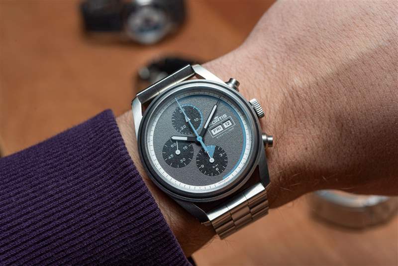 Stratoliner 有多種表盤組合可供選擇,就連貫性和獨特性的理想融合而言,極地白色和藍色表盤可能是其中最好的。Fortis 為其表盤的纖薄而感到自豪,而且小表盤是平坦的,而不是凹陷的;日期和星期顯示都比平常更清晰,更靠近水晶。指針大而易讀,具有強烈的夜光和黑色輪廓,注射器式分針以精致的刻度準確地指示分鐘。雖然繁忙的秒針刻度非常適合準確讀取計時秒針,但它使分鐘的讀取變得復雜。由于每隔五個位置沒有一個大的時標,因此以分鐘的精度報時需要一些時間來適應。