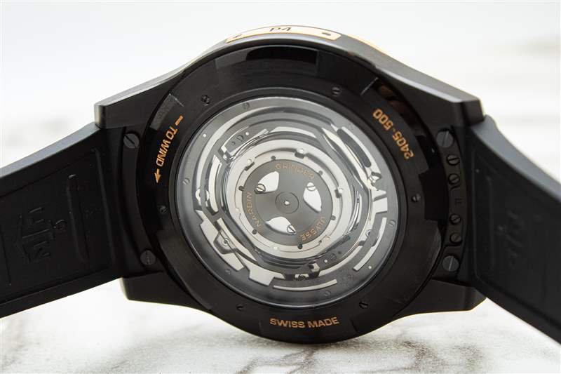當(dāng)然,實(shí)際上 Freak ONE 并沒(méi)有什么平庸之處,仔細(xì)觀察紅金表圈就可以立即看出這一點(diǎn)?;谶@種拉絲和拋光元件中尖銳的刻面圖案,這個(gè)表圈可能看起來(lái)不對(duì)齊,但這是 Freak ONE 獨(dú)特的上鏈和時(shí)間設(shè)置系統(tǒng)的唯一真正的視覺(jué)線索。翻轉(zhuǎn) 6 點(diǎn)鐘位置的“Freak”牌,旋轉(zhuǎn)表圈就會(huì)解鎖,但旋轉(zhuǎn)的不僅僅是表圈本身。扭轉(zhuǎn)這個(gè)雙向表圈還可以向前和向后調(diào)整時(shí)間設(shè)置,為佩戴者提供與 Freak ONE 啟動(dòng)對(duì)話的齒輪系的大規(guī)模觸覺(jué)連接。在背面,藍(lán)寶石顯示屏底蓋同樣非正統(tǒng)。通過(guò)逆時(shí)針旋轉(zhuǎn)底蓋外環(huán),佩戴者可以手動(dòng)為機(jī)芯上弦,盡管 Freak ONE 的創(chuàng)新上鏈系統(tǒng)使得這一點(diǎn)基本上沒(méi)有必要(稍后會(huì)詳細(xì)介紹)。雖然 Freak ONE 的外殼非常耐磨,而且充滿了有趣的花招,但它的致命弱點(diǎn)就是防水。這是該手表日常佩戴理念面臨的最大障礙,因?yàn)?30 米的深度等級(jí)讓 Freak ONE 根本無(wú)法勝任許多運(yùn)動(dòng)場(chǎng)合的任務(wù)。