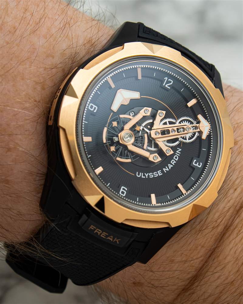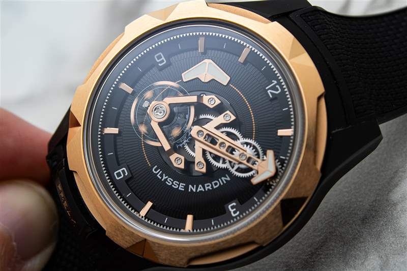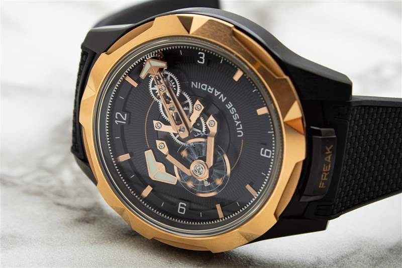 與表殼一樣,雅典表 Freak ONE 的鏤空表盤(pán)以之前的 Freak 型號(hào)為基礎(chǔ),但以更簡(jiǎn)潔、更精致的方式呈現(xiàn)了這些概念。嚴(yán)格來(lái)說(shuō),只有帶有淺色印刷阿拉伯?dāng)?shù)字和鑲貼金質(zhì)時(shí)標(biāo)的狹窄外圈是真正的表盤(pán)表面,藍(lán)寶石水晶下方的所有其他部件都是機(jī)芯部件。大部分空間被一個(gè)寬大的啞光黑色圓盤(pán)占據(jù),圓盤(pán)上有精致的脊?fàn)罴y理,并印有雅典表的文字標(biāo)志。由于此處采用寬大且?guī)в写罅恳构獾慕鹕切涡螤?,該旋轉(zhuǎn)圓盤(pán)可用作時(shí)針。然而,真正搶盡風(fēng)頭的是分針。這是 Freak 系列的標(biāo)志性碟形盤(pán),這是一個(gè)旋轉(zhuǎn)齒輪系組件,每小時(shí)在表盤(pán)上繞一圈,本質(zhì)上允許機(jī)芯,圍繞自身旋轉(zhuǎn)。與之前的 Freak 迭代相比,該組件在視覺(jué)上顯著簡(jiǎn)化,但 Ulysse Nardin 在形式上添加了對(duì)其自身傳統(tǒng)的厚顏無(wú)恥的認(rèn)可。包含齒輪系組件和分鐘標(biāo)記的主橋結(jié)構(gòu)也形成了該品牌的標(biāo)志性錨徽。錨標(biāo)志出現(xiàn)的唯一其他地方是表帶襯里,這使得這是一個(gè)令人印象深刻的克制品牌活動(dòng)。飛行擺輪橋作為分針的配重,與鏤空表盤(pán)表面上方的齒輪系一起旋轉(zhuǎn),成為動(dòng)態(tài)的視覺(jué)亮點(diǎn)。此外,由于擒縱機(jī)構(gòu)安裝在旋轉(zhuǎn)組件上,F(xiàn)reak ONE 在技術(shù)上還具備 60 分鐘陀飛輪復(fù)雜功能。這是最頑固的運(yùn)動(dòng)書(shū)呆子們的話題,