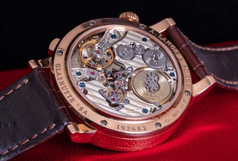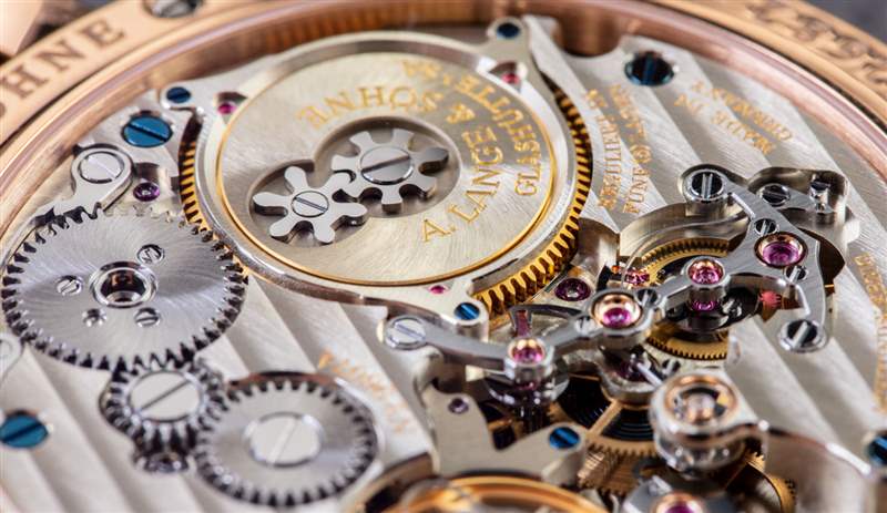 由 528 個零件制成的 L043.2 機芯在視覺上令人驚嘆。與其他朗格 (A. Lange & Sohne) 機芯一樣,該機構不僅完全由手工裝飾,而且一旦機芯最初組裝,就會被拆開、檢查,然后重新組裝。我在上面提到了該機制如何包括恒力擒縱系統。這樣做的目的是確保從為手表提供動力的主發條盒為運行報時系統的齒輪系提供更加一致的動力量。通過表殼后部可以直觀地看到恒力機制在發揮作用,因為它會產生動力,然后以一致的脈沖將動力傳遞給齒輪系。該機芯由德國銀制成(隨著時間的推移會形成迷人的銅綠),并使用大量高端功能,