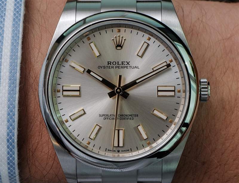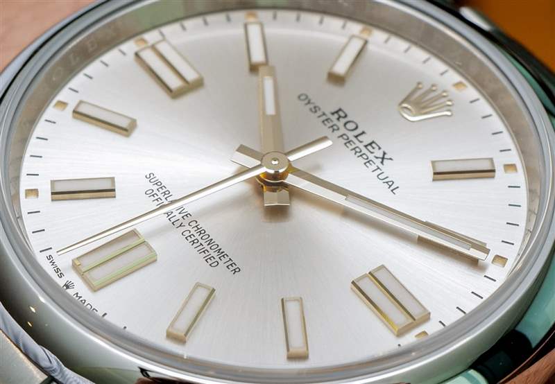 勞力士更新了蠔式恒動(dòng) 41 表盤,而不僅僅是新顏色。2020 年,3 點(diǎn)鐘、6 點(diǎn)鐘和 9 點(diǎn)鐘位置的時(shí)標(biāo)采用“雙條”設(shè)計(jì),尺寸更大,視覺(jué)上營(yíng)造出更熟悉 Submariner 的外觀——表盤上有不同的時(shí)標(biāo)形狀。許多收藏家可能會(huì)注意到蠔式恒動(dòng) 41 上存在“雙條”時(shí)標(biāo)。毫無(wú)疑問(wèn),他們會(huì)注意到新的顏色選項(xiàng)。其中最大膽的是黃色、綠松石色和“珊瑚紅”表盤顏色。124300 腕表還提供傳統(tǒng)的“亮黑色”、帶有金色標(biāo)記和指針的銀色、深金屬色“亮藍(lán)色”和森林綠色表盤顏色選項(xiàng)。在我們與勞力士會(huì)面時(shí),他們并沒(méi)有全部 41 毫米寬的表盤顏色版本