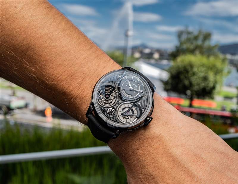 沒有受到大流行影響的是奢侈品定價,因此,這件高級鐘表的價格接近 100,000 美元大關(guān)。43.5 毫米寬的表殼由 5 級鈦金屬精密加工而成,然后經(jīng)過 DLC 涂層處理,以防變色和防刮擦。藍寶石水晶夾在 50 米防水表殼上,表殼配有啞光黑色鱷魚皮表帶。