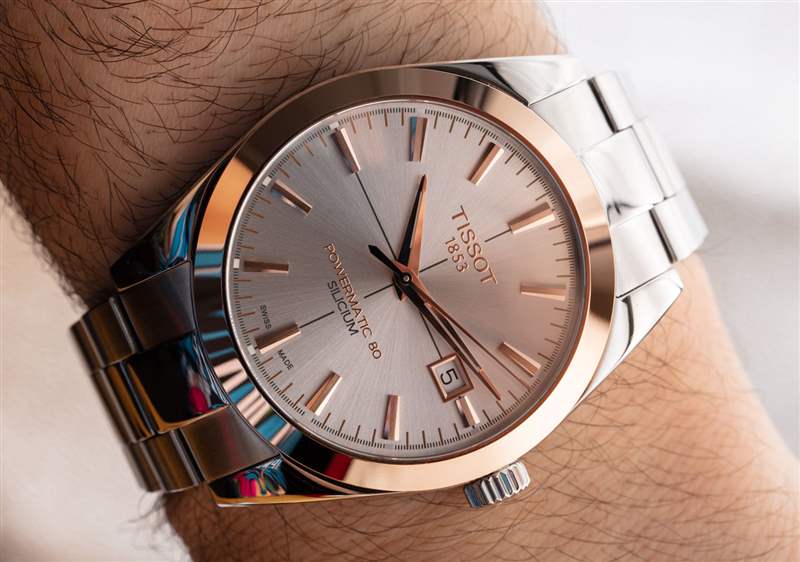 在產(chǎn)品組合中添加黃金很有趣,而且情緒激動。有很多像這樣的手表,其金色表圈采用 PVD ??涂層或鍍金制成。這款 Tissot Gentleman Automatic T-Gold 采用真正的 18k 玫瑰金,使產(chǎn)品與眾不同。它牢牢地將其置于奢侈品類別中——至少可以說,這一切的價格都是罕見的。這只表的功勞不僅僅是“這里有一些真正的黃金”。