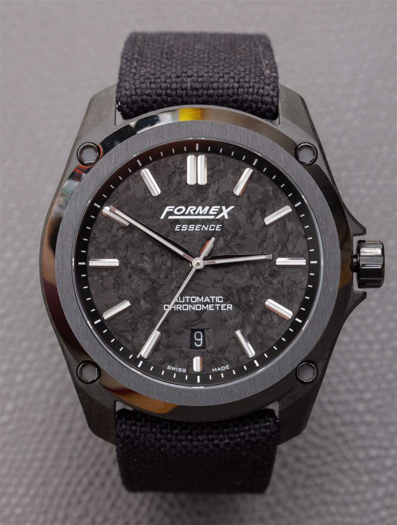 鍛造碳是一種使用碳作為精密表殼材料的方法。它由 Audemars Piguet 推廣,在最終普及之前,它被用于相當昂貴的豪華手表。愛彼在內部生產這種材料,這意味著其他使用鍛造碳的公司必須復制類似的過程才能達到自己的結果。并非所有鍛造碳纖維的外觀或感覺都相同,Formex 使用的碳纖維觸感既光滑又“柔滑”(不粗糙或不均勻)。鍛造碳首先壓縮一些碳材料,然后在高溫下烘烤。然后將產生的“鍛造碳”塊加工成表殼的形狀。