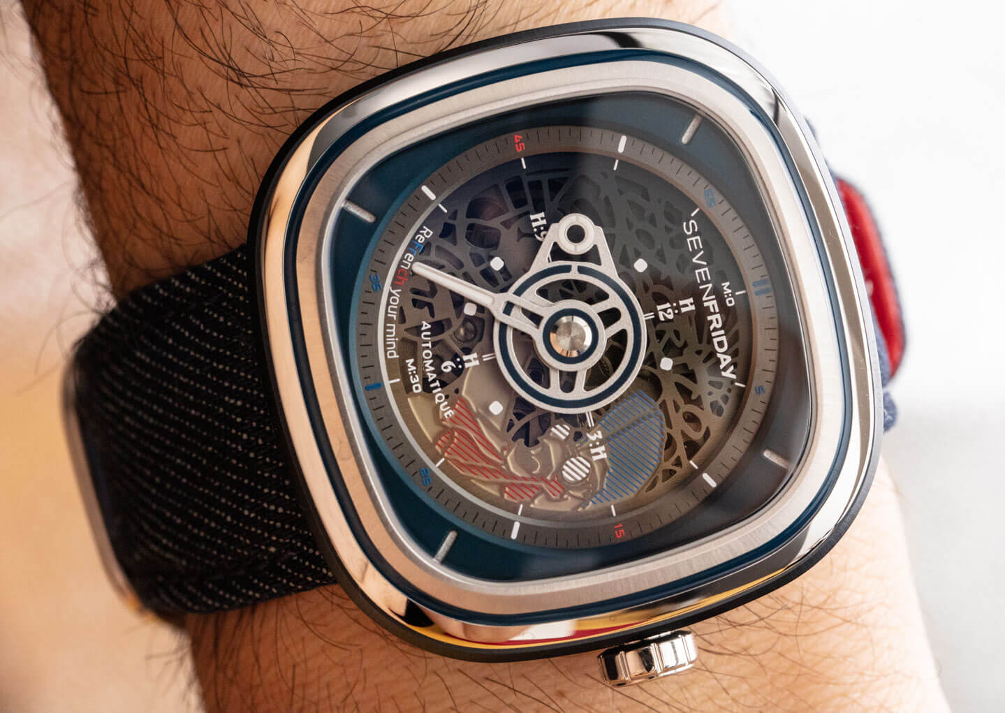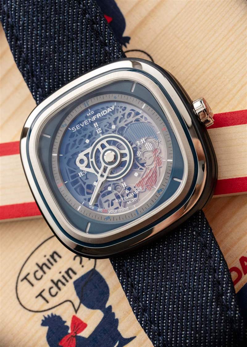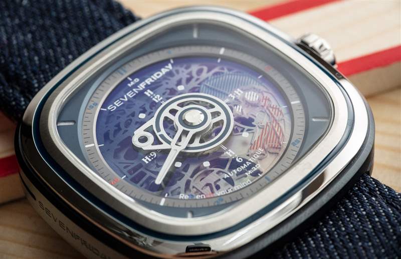 我們在 SevenFriday 產品中繼續看到的小細節使它們變得最有趣。以表帶后部的雞腳印為例。表帶本身采用紅色皮革和藍色牛仔布制成,并以特殊形狀制成,旨在與表殼相得益彰。當手表產品每個系列都有這么多定制零件時,很難抱怨價格。