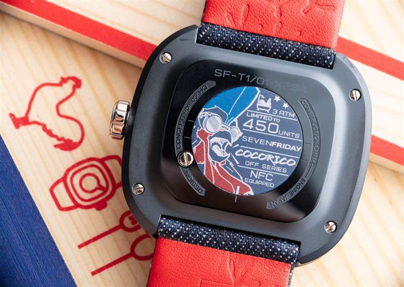 在手表的背面,你有漂亮的額外的 Cocorico 藝術品,雞的角色更加清晰可辨。您還可以看到,這款手表是 SevenFriday 更前衛的“Off 系列”(SevenFriday 設計師進行了更多實驗)的一部分,并且 T1 手表系列還具有內置的 NFC(近場通信)芯片。該芯片用作手表的個性化標識符,并且比雕刻/蝕刻序列號更安全。如果您想使用此功能,那么您可以使用支持 NFC 掃描的手機和專門的網站來讀取芯片并將您的手表注冊為所有者。