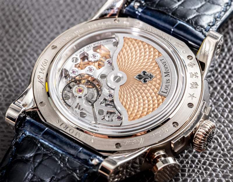 特殊之處在于,作為 Louis Moinet 口徑 LM54 自動機(jī)制的一部分,您如何可以通過大部分表盤看到計(jì)時(shí)碼表機(jī)芯部件。機(jī)芯本身是一款裝飾精美的 4Hz 自動上鏈機(jī)芯,擁有 48 小時(shí)動力儲存,由 302 個(gè)零件組成。到目前為止,Louis Moinet 已經(jīng)生產(chǎn)了幾個(gè)版本的 Memoris,其前表盤機(jī)芯在整個(gè)系列中略有不同。對于這個(gè)型號(參考 LM-54.70.80B,在 18k 白金表殼中),表盤大部分為復(fù)古銀色,表盤為白色琺瑯,后機(jī)芯板為 PVD ??藍(lán)色涂層。如果您查看其他 Louis Moinet Memoris 手表,您會發(fā)現(xiàn)該品牌如何創(chuàng)造出一系列值得選擇的款式。雖然所有的 Memoris 手表似乎都是限量版的一部分,