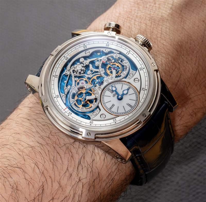 我實(shí)際上在 Louis Moinet 網(wǎng)站上找不到 Memoris 手表尺寸。也許他們發(fā)現(xiàn)人們在閱讀時(shí)會感到“尺寸震驚”。老實(shí)說,那塊表并沒有那么大。表殼寬約 46 毫米,厚約 18 毫米,表耳到表耳的距離約為 53 毫米。表盤上有一個(gè)圓頂 AR 涂層藍(lán)寶石水晶鏡面,機(jī)芯上方有其他扁平藍(lán)寶石水晶鏡面,作為表殼后部的窗口。附在手表上的是一條高品質(zhì)的藍(lán)色鱷魚皮表帶。佩戴舒適度不錯(cuò),但這是一塊更大的手表。我喜歡 Louis Moinet Fleur-de-lys 風(fēng)格的標(biāo)志搭扣,但我認(rèn)為這款手表戴在傳統(tǒng)的針式搭扣上會更舒適一些。