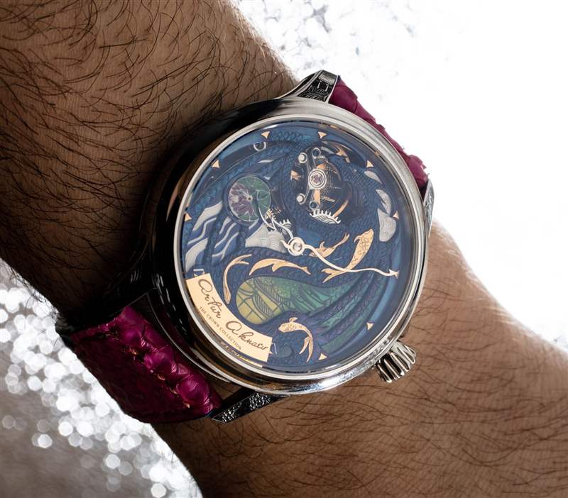 為了與色彩繽紛的 The Rise Of The Blue Dragon 表盤相得益彰,Akmaev 有一條在美國生產(chǎn)的定制表帶,它是藍色皮革底座,頂部縫有粉紅色的蟒蛇皮“翅膀”。當然,表帶有點華而不實(在其他華而不實的手表上),但我認為它有助于完善手表的活潑個性。以龍為主題的腕表在腕表領(lǐng)域并不罕見,但有趣的是龍主題是如何以如此多不同的方式表達的。我認為 Artur Akmaev 會發(fā)現(xiàn)足夠多的手表愛好者對他在這些非常真實的時計上手工繪制神話野獸的特殊方式感興趣。
