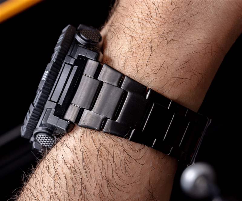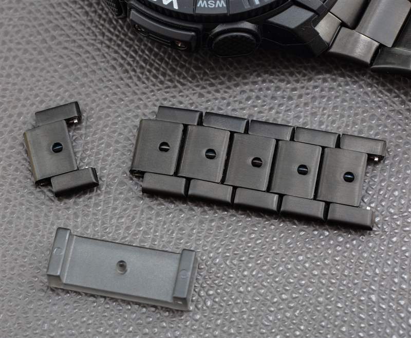 Pro Trek 也是一款重量更輕的手表,即使在鈦金屬表鏈上也非常明顯。總的來說,這款手表的重量僅為 64 克。在手腕上,你真的感覺不到任何東西在那里。最后,Pro Trek PRT-B50 在易讀性方面略勝過 G-Shock Mudmaster GG-B100,這要歸功于表盤的高對比度和非常易于閱讀的指針和時標(兩者都涂有夜光漆) )。同樣,如果您想要一個帶有鈦手鏈的 G-Shock,它的價格將比 PRTB50YT-1 的零售價高出很多。說到手鏈,讓我稍微討論一下,因為對我來說,這是一個新的手鏈設計,我認為它的巧妙工程需要一些討論。