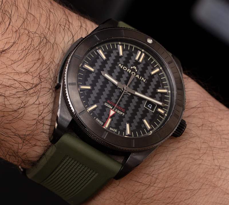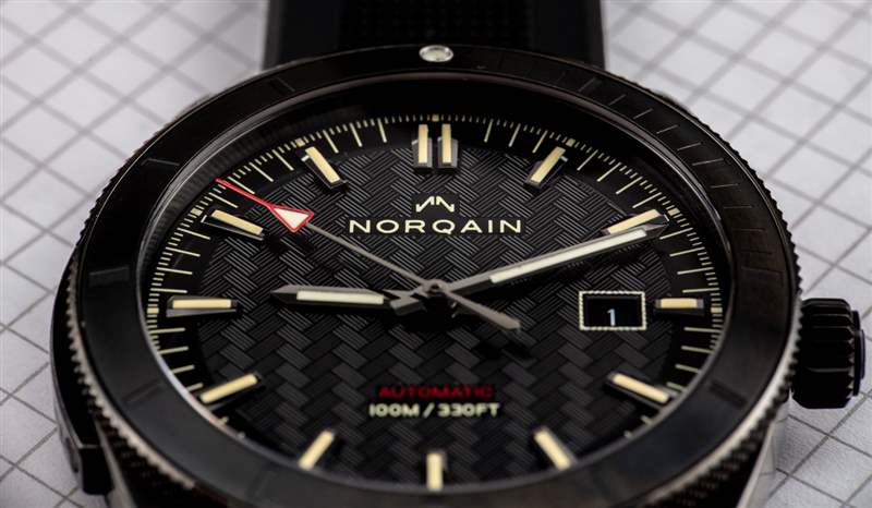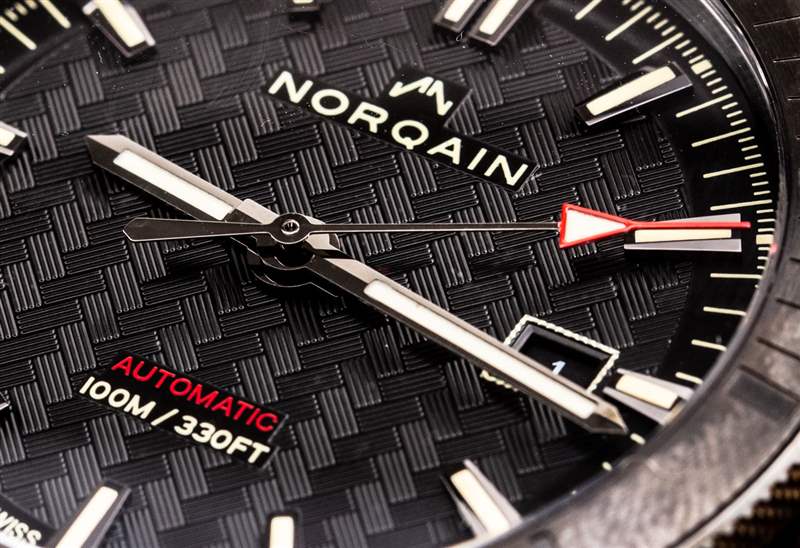 Adventure Sport DLC 表盤效果很好,因為它首先應用了模擬表盤易讀性和比例的久經考驗的真實規則。時針和時標在臉上形成鮮明對比,指針大小都合適。盡管 Norqain 為表盤本身使用了特殊的紋理,但它只是增強了表盤的個性,卻不影響核心的可讀性(紋理在現實生活中比 Norqain 的營銷照片中的紋理更微妙)。我也喜歡 Norqain 選擇用于指針和時標上的發光顏色的米白色奶油色。他們稱這種顏色為“老鐳”,這很有趣,因為實際的鐳既具有放射性又很危險。(這是 Super-LumiNova。)純白色看起來不會那么有趣,