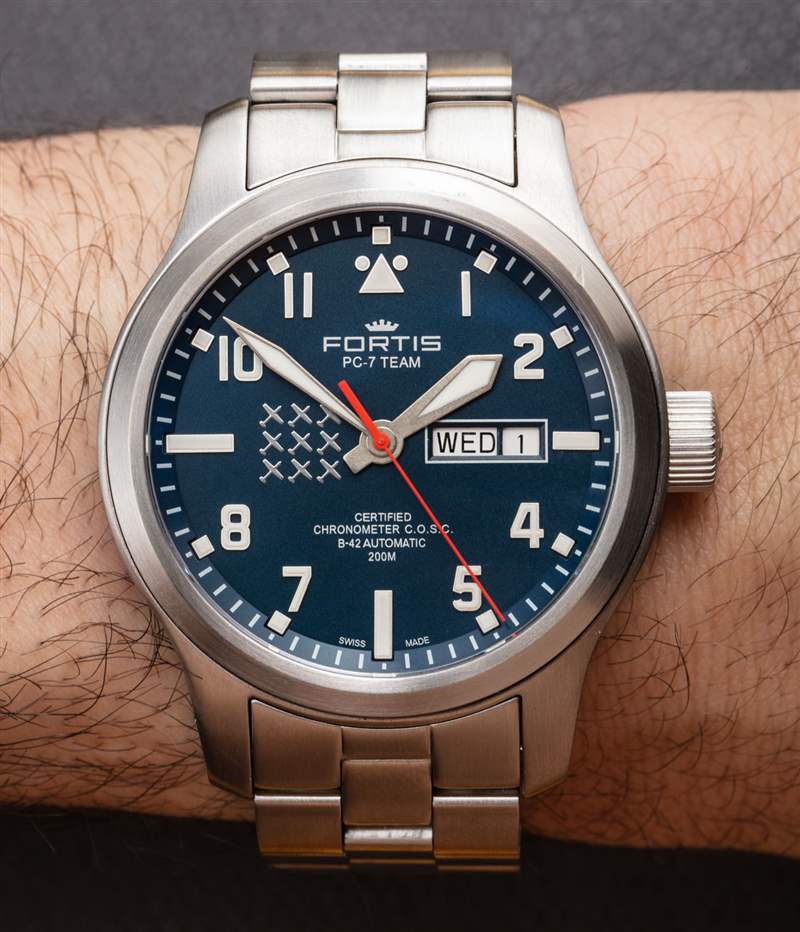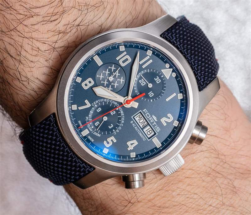 任何尋求具有良好歷史基礎和大膽但不過度尺寸比例的略帶現代飛行員風格計時碼表的人都應該考慮 Aeromaster 時計系列。Aeromaster 系列中目前最昂貴的型號不是這些限量版 PC-7 Team 型號,而是 Aeromaster Alarm Chronograph,它為基礎 Valjoux 7750 增加了機械報警功能,由 Paul Gerber 為 Fortis 完成。限量版每件 300 件,零售價高于非限量版 Aeromaster 型號。Fortis 確實提供了表帶/手鏈組合,但如果這些藍色表盤 PC-7 Team 型號的價格和款式不完全適合您的口味,則值得關注更大的 Aeromaster 系列。盡管如此,任何手表愛好者都可以同意,富通目前的 Aeromaster 系列不僅僅是體面的東西。