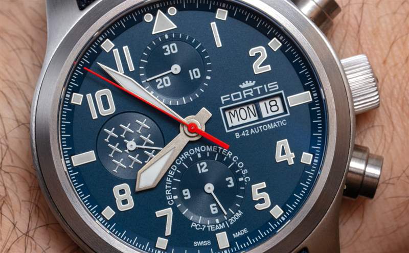 Aeromaster 表盤做得非常好。首先是藍寶石水晶鏡面,兩面都涂有增透膜,表盤上幾乎沒有拋光元素。深藍色表盤頂部飾有緞面和夜光填充時標,以及相配的指針。兩款 PC-7 限量版腕表均在表盤 9 點鐘位置放置“飛機井字游戲”PC-7 Team 標志,并以中央秒針的顏色呈現紅色的暗示手。表盤是 PC-7 Team 限量版手表的最佳元素之一,但 Aeromaster 系列也是如此,一般來說,Fortis 一些最漂亮的現代手表是其中的一部分。