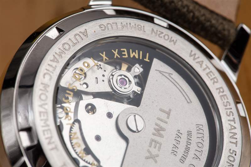 Todd Snyder X Timex Liquor Store 手表的世紀中葉風格表盤搭配橄欖綠色織物表帶(如今的時尚款式),皮革襯里舒適耐用。手表內部是日本 Miyota 自動機芯,可以通過底蓋窗口看到。