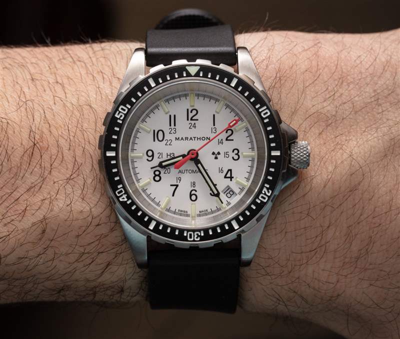 看看 Medium Diver’s Quartz 鋼表鏈上相對裸露的展開器和北極 MSAR Auto 上的版本,我認為 Automatic 上的那個是明顯的贏家。盡管表殼只有 36 毫米寬,但它的高度約為 14 毫米,凸耳到凸耳的距離為 43 毫米。高大的單向旋轉(zhuǎn)表圈(帶有對比鮮明的黑色嵌件)是 Marathon 的標志,此時,表盤上方是平坦的 AR 涂層藍寶石水晶鏡面。由于這是一款 MSAR 收藏時計,時標和指針配有氚氣管,用于黑暗照明。請注意,這款手表的石英版本的秒針沒有氚氣管(它使用標準的光充電流明),但這款自動版本的指針有。為什么?因為通常石英機芯不能承載一定重量的手,而且,廣告訊息廣告信息結(jié)束