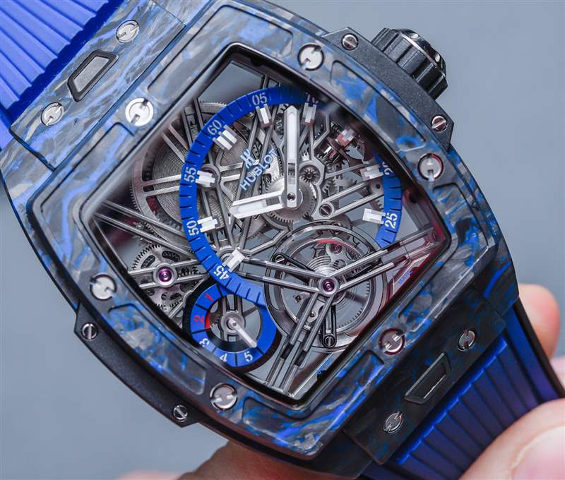 多年來,Hublot 一直在研究表殼尺寸,并在 Big Bang 精神中加入了許多機芯選項,從各種內部制造的機芯到 Zenith El Primero 計時碼表機芯(Zenith 和 Hublot 都屬于 LVMH 奢侈品集團)。今天,我來看看一款現代的 Hublot Spirit Of Big Bang 腕表,它既現代又奢華,與原來的 Hublot Masterpiece 非常相似。今天在 aBlogtoWatch 上動手操作的是 Hublot Spirit Of Bang Tourbillon Carbon 42mm 的碳藍和碳黑。Big Bang 精神陀飛輪 42 毫米碳黑是參考 645.QN.1117.RX 而 Big Bang 精神陀飛輪 42 毫米碳藍色是參考 645.QL.7117.RX。兩者均限量 100 件。