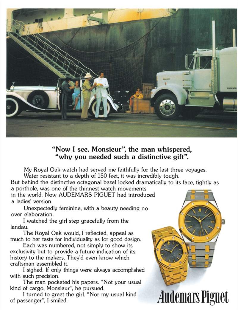 愛彼 (Audemars Piguet) 在 1970 年代初期通過大膽的營銷活動(dòng)推出了皇家橡樹(當(dāng)時(shí),手表品牌心甘情愿地理解在手表周圍創(chuàng)造廣告?zhèn)€性的重要性,而不僅僅是美學(xué)設(shè)計(jì),這是一種令人遺憾的失傳藝術(shù))。營銷活動(dòng)的重點(diǎn)是 Audemars Piguet 以金表的價(jià)格出售 Royal Oak 鋼表這一大膽事實(shí)。為什么雄心勃勃的定價(jià)?因?yàn)閻郾藢⑹直淼臉?gòu)造和裝飾視為復(fù)雜的珠寶,而不是戴在手腕上的表帶上的小懷表。為什么愛彼首先生產(chǎn)皇家橡樹?我的理解是,這是為了安撫意大利的手表經(jīng)銷商(總是時(shí)尚前衛(wèi)),他們希望為那些活動(dòng)需要運(yùn)動(dòng)手表的富有客戶提供優(yōu)質(zhì)手表。