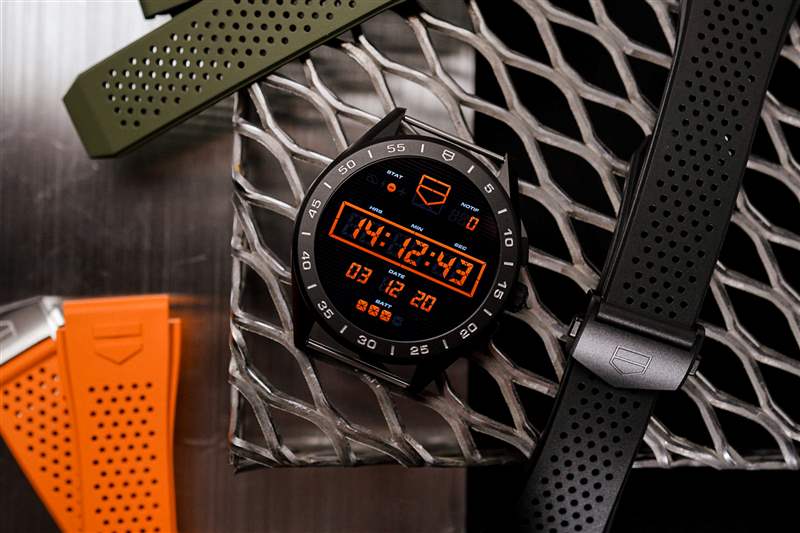 TAG Heuer Connected 智能手表預(yù)裝了一系列模擬和數(shù)字風(fēng)格的“表盤”。每個人都有獨(dú)特的風(fēng)格,總的來說,他們做得很好,沒有明顯的贏家。我確實喜歡 TAG Heuer 混合使用新概念以及制作相當(dāng)精致的模擬表盤數(shù)字版本。該系統(tǒng)還支持常亮屏幕,它在“空閑”狀態(tài)下不會超亮,但足以讓佩戴者輕松閱讀(只是很難用相機(jī)拍攝)。與泰格豪雅交談,很明顯設(shè)計團(tuán)隊將定期推出新的智能手表表盤,用戶可以通過泰格豪雅 Connected 應(yīng)用程序下載這些表盤。