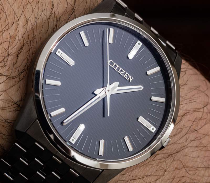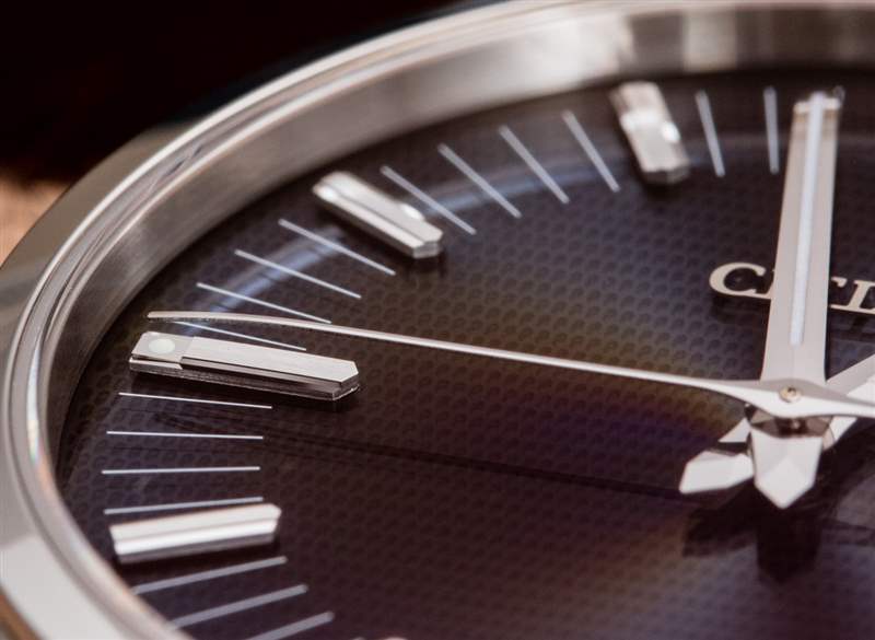 表盤設計本身很簡單,如果不是極簡的話。除了 6 點鐘位置的一些小文字外,Calibre 0100 表盤上唯一的文字是應用的 Citizen 徽標。大部分表盤專門用于鉆石拋光(也有拉絲部分)指針和匹配的時標。它們超平坦的拋光表面反射光線,帶來奢華感,但不會模糊光線,這會妨礙易讀性。表盤也有薄的、印刷的第二個指標,幾乎沒有別的。然而,表盤并非沒有細節(jié)。