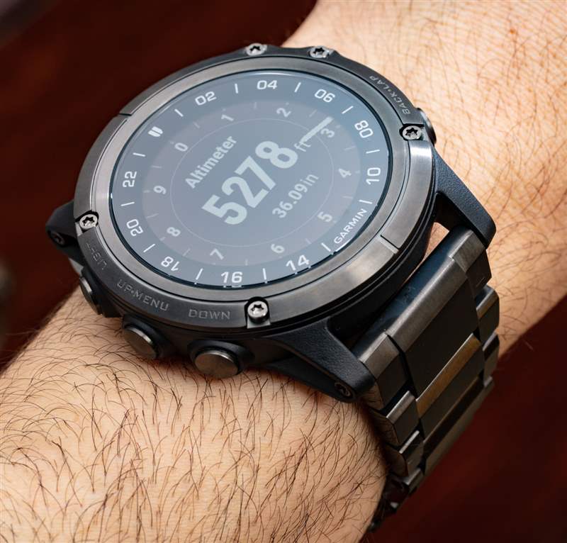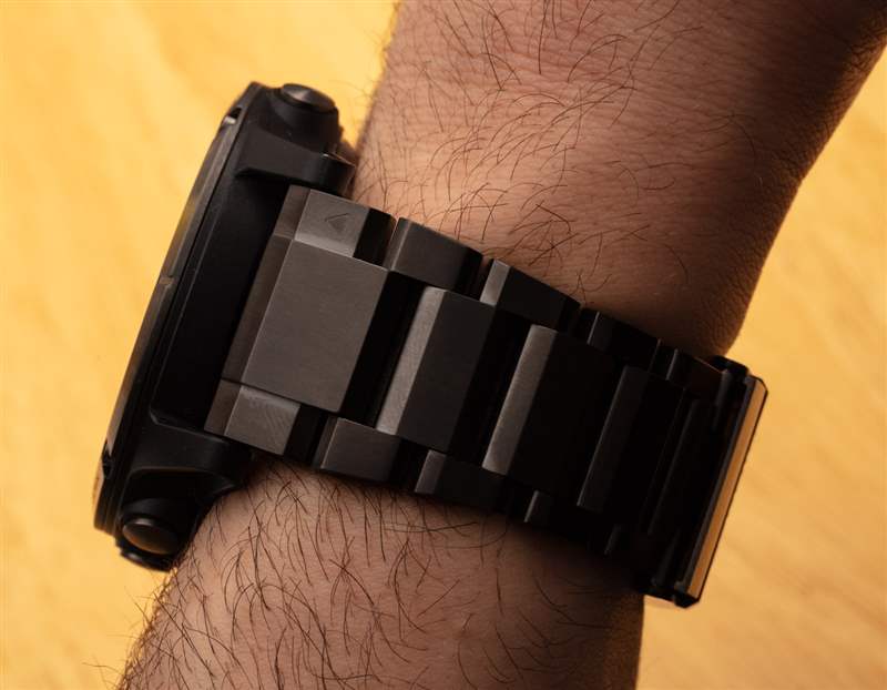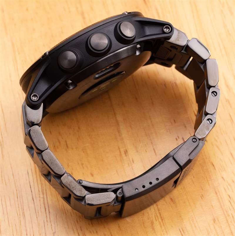 Garmin 的網站上提供了 D2 Delta PX 技術規格的完整列表,但我將介紹手表本身的物理構造。Garmin 生產的其他 D2 Delta 手表的寬度為 42 毫米或 47 毫米。D2 Delta PX(參考 010-01989-30)全寬 51 毫米。它也是唯一一款由鈦制成的 D2 Delta,因為其他型號都是鋼制的。鈦是 DLC,涂有深碳色。該涂層增加了一層顯著的表面抗劃傷性,這是一件非常好的事情。盡管 D2 Delta PX 可以佩戴在可用的硅膠表帶上,但它在 Garmin 大而輕的鈦手鏈上看起來非常漂亮。總的來說,盡管這款智能手表的尺寸很大,但佩戴在手腕上還是比較輕巧舒適的。