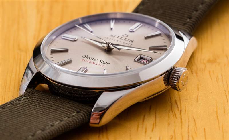 今天,Milus 提供銀色或黑色表盤的 Snow Star。(它實際上有一些黃色調(diào),所以看起來像“淡香檳”。)我推薦銀色表盤有兩個原因。首先,因為太陽光飾面的亮黑色表盤與拋光指針搭配時會產(chǎn)生易讀性問題。其次,銀色表盤代表了歷史悠久的雪星手表的外觀。表盤采用迷人的太妃式指針和有趣的應用時標,為原本保守的包裝增添了有趣且略帶時髦的元素。這里沒有發(fā)光體,但有一個帶有所有紅色數(shù)字的日期窗口。表盤上的標記主要是指具有歷史意義的 Snow Star 系列(即時更改日期很重要)。總體來說,雪星表盤帥氣又經(jīng)典的風格讓它非常時尚,