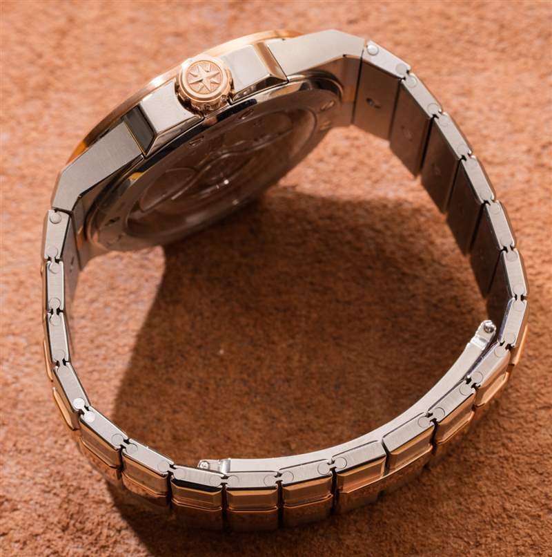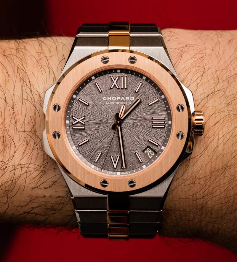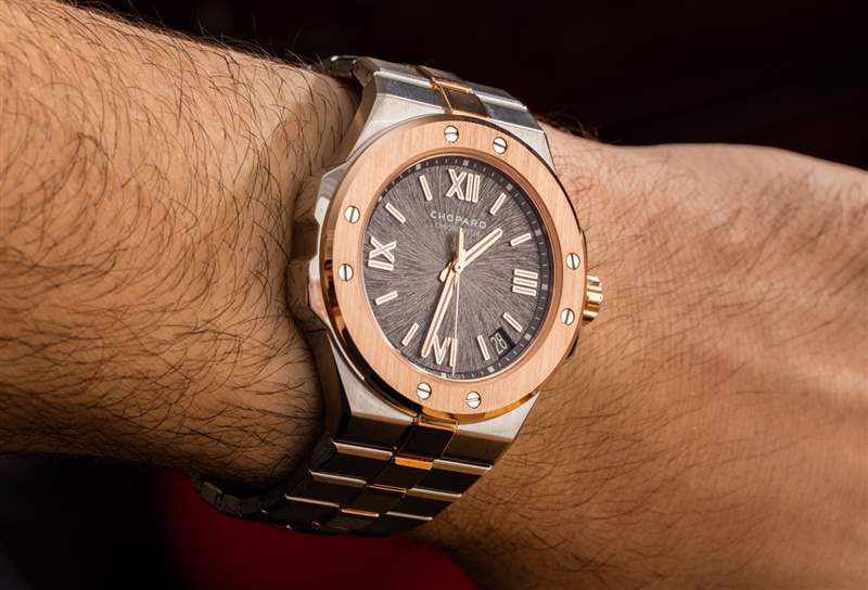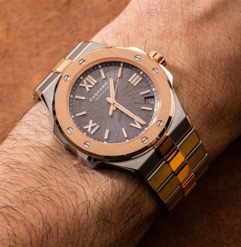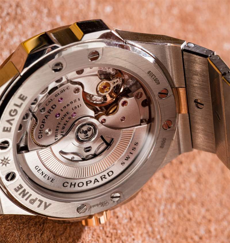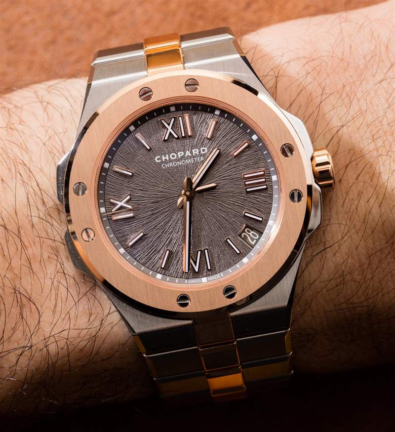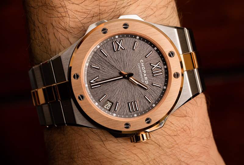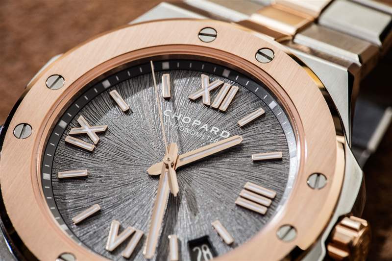 41 毫米寬的表殼(也可提供 36 毫米寬的女性型號(hào))是一個(gè)很好的通用尺寸,表殼厚度也設(shè)法低于 10 毫米(防水 100 米),從而實(shí)現(xiàn)纖薄手腕輪廓。我會(huì)說(shuō)表圈(這里是 18k 玫瑰金)看起來(lái)有點(diǎn)像刮擦磁鐵(特別是由于拉絲處理)。從美學(xué)上講,它看起來(lái)很華麗,但我不禁覺(jué)得蕭邦可能會(huì)考慮為一些未來(lái)的 Alpine Eagle 型號(hào)的表圈考慮防刮金屬合金、陶瓷或其他材料。