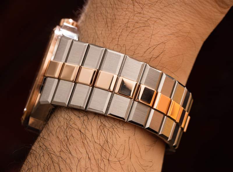 Alpine Eagle 的另一件美麗之處是手鐲。它的視覺(jué)設(shè)計(jì)并不符合每個(gè)人的口味,但嚴(yán)格的公差和整體工程確實(shí)令人印象深刻。不幸的是,這一切都是從最初的 St. Moritz 手表開(kāi)始的,但對(duì)于 Alpine Eagle,Chopard 確實(shí)將手鏈投入到類(lèi)固醇和超速運(yùn)轉(zhuǎn)中,以打造一款外觀(guān)精美且制作精良的珠寶式手鏈。這可能是我最喜歡的手表部分。手鏈以“神秘”的隱藏展開(kāi)式表扣優(yōu)雅閉合。然而,如果能看到微調(diào)功能或類(lèi)似系統(tǒng),除了方便之外,還能幫助蕭邦在競(jìng)爭(zhēng)中擁有更多的功能優(yōu)勢(shì),那就太好了。
