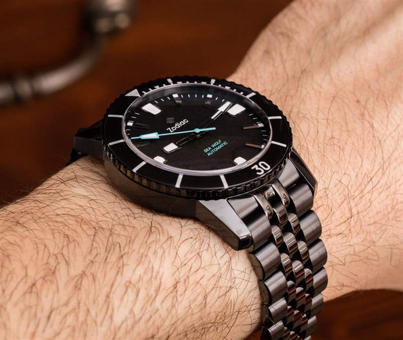 對(duì)比度很有趣,因?yàn)殡m然它可以在幾乎所有情況下幫助易讀性,但太多的對(duì)比度會(huì)導(dǎo)致強(qiáng)烈的對(duì)比色……這會(huì)導(dǎo)致整體優(yōu)雅的侵蝕。在 Super Sea Wolf 53 Black 上特別好用的是黑色 40 毫米寬的表殼和配套的表鏈。至少可以說(shuō),很難找到這樣的黑色手鏈,因?yàn)槭宙湹拿恳粔K都應(yīng)該單獨(dú)涂層。我不確定 Zodiac 使用了什么工藝(因?yàn)檫@款手表的售價(jià)僅比非黑色款高一點(diǎn)),但鋼表鏈上的黑色涂層非常均勻,有助于為這款表鏈設(shè)計(jì)注入新的活力。廣告訊息廣告信息結(jié)束