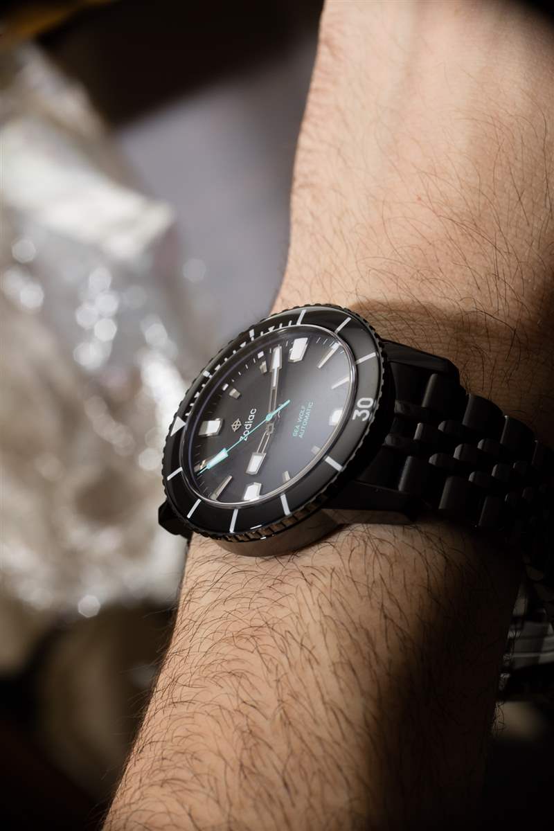 Zodiac 使用發(fā)光體和表盤(pán)顏色來(lái)創(chuàng)建有利于易讀性的高對(duì)比度區(qū)域。在這方面,Super Sea Wolf 53 Black 的易讀性非常高,但令我有些困擾的是,主要的 12、3、6 和 9 點(diǎn)鐘時(shí)標(biāo)比其他時(shí)標(biāo)大得多。這只是弄亂了面部的整體對(duì)稱性和平衡,這種涂黑的 Super Sea Wolf 53 Black 與其他具有相同表盤(pán)設(shè)計(jì)的 Super Sea Wolf 53 非黑色手表的對(duì)比更加強(qiáng)調(diào)了這一點(diǎn)(保存為不同的顏色)。