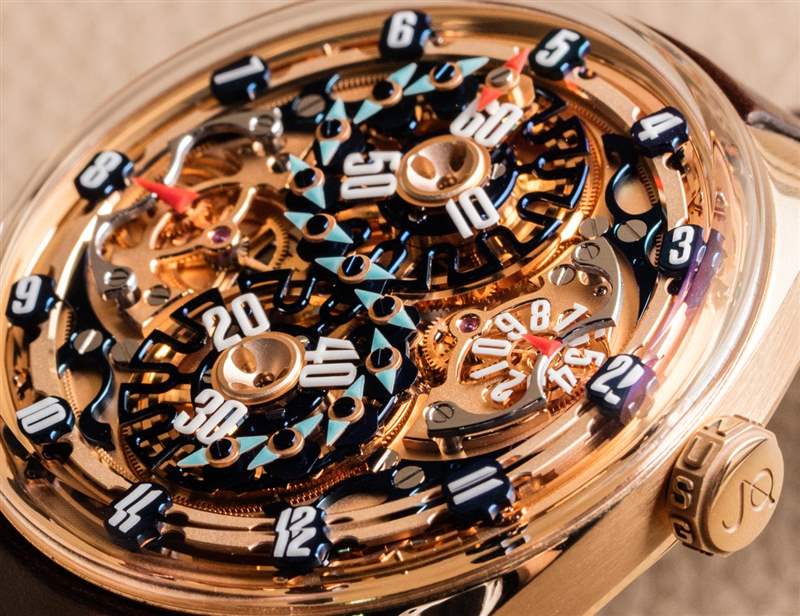 Genus GNS 上的時(shí)間是如何顯示的?它有我稱之為“蛇形”的一排指示器,有點(diǎn)像一條蛇,上面有一個(gè)“頭”作為手,然后是一系列其他移動(dòng)的部分,它們?cè)谀抢锲鸬阶饔谩N覒?yīng)該說,在其他 Genus 模型的一些圖像中,只有蛇形指針的前導(dǎo)部分在表盤上——所以我認(rèn)為指針部分的完整“火車”對(duì)于 Genus 表盤概念是可選的。蛇形指針以 8 字形圍繞表盤移動(dòng),同時(shí)兼作分針。實(shí)際上,蛇形指針系統(tǒng)只是分鐘指示器的一部分,提供分鐘的第一位數(shù)字,而 3 點(diǎn)鐘位置的較小表盤提供兩位數(shù)字分鐘指示讀數(shù)的第二位數(shù)字。大多數(shù)時(shí)候,用戶可以只依靠蛇形指針來測(cè)量當(dāng)前的分鐘數(shù),