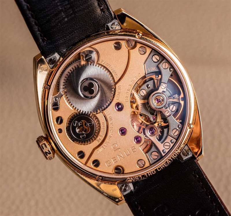 Genus GNS 1.1 RG 外殼寬 43 毫米,厚 13.1 毫米,防水深度達(dá) 30 米。雖然很簡單,但帶有金色拉絲飾面的表殼實(shí)際上相當(dāng)吸引人,而合身的表帶大大有助于改善外觀。表盤上的“盒子式”藍(lán)寶石水晶實(shí)際上是那些更復(fù)古的元素之一,有助于很好地展示現(xiàn)代表盤。將手表翻過來,透過藍(lán)寶石水晶底蓋窗口,您會(huì)看到機(jī)芯的另一面出現(xiàn)——再次非常傳統(tǒng)與現(xiàn)代。