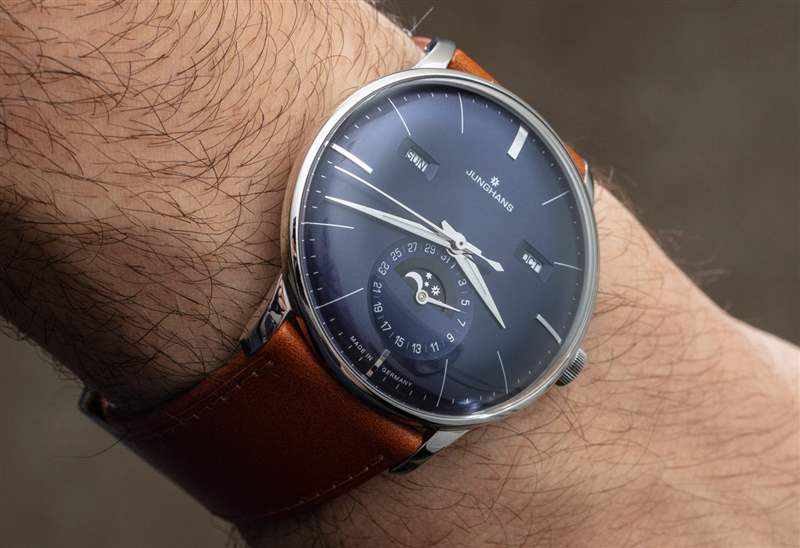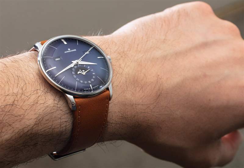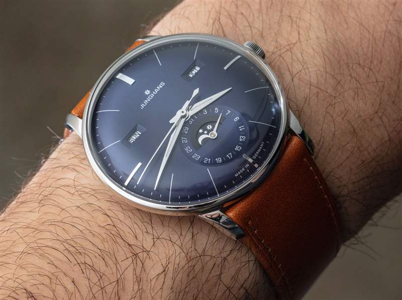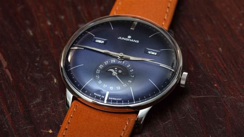 作為一款日歷手表,Meister Calendar 提供月份、星期幾、日期和月相指示器。我認為機芯是一個完整的日歷,在奇數月需要調整日歷方面,它有點低于年歷。要調整日歷設置,只需使用位于表殼兩側的小嵌入推桿。我真正喜歡的是信息的傳統對稱布局,以及窗口的使用(與所有表盤相反)。表盤用于日期指示器,其中有一個用于月相指示器的窗口。請注意,Junghans 為手表提供英文或德文的日歷信息。