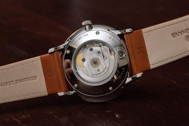 手表內部看起來是一個基本的瑞士 ETA(或等效)自動機芯,上面有一個用于日歷信息的模塊。Junghans 將其稱為 J800.3 機芯,其工作頻率為 4Hz,具有 38 小時的動力儲存。您可以通過手表后部查看機芯及其精美的拋光裝飾。