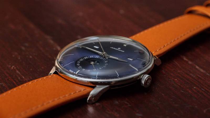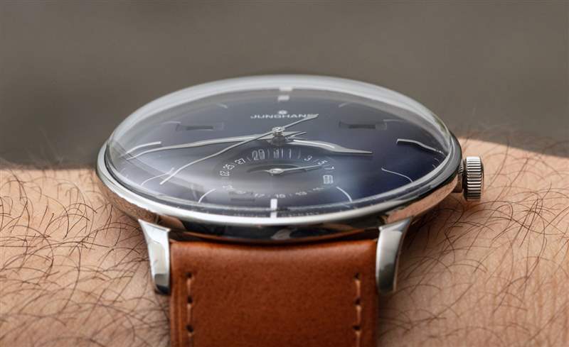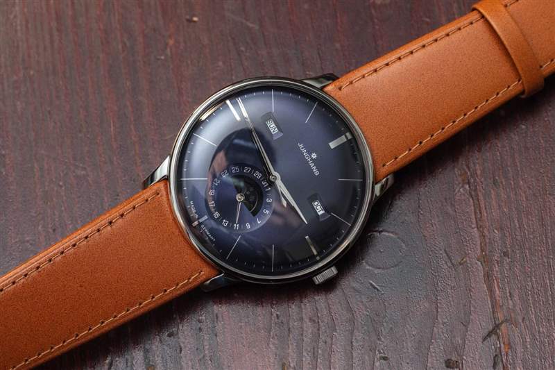 手表上的傳統元素比比皆是,包括與表殼和水晶相匹配的弧形表盤。很少看到用這種弧形表盤生產的手表。令人印象深刻的是,Junghans 能夠隱藏機芯的相對厚度,因為它既有基礎機芯,也有日歷信息模塊。太陽紋處理過的藍色表盤帶有近乎紫色的色調,質地非常棒,因為它有一點光澤,但不會反射造成眩光。