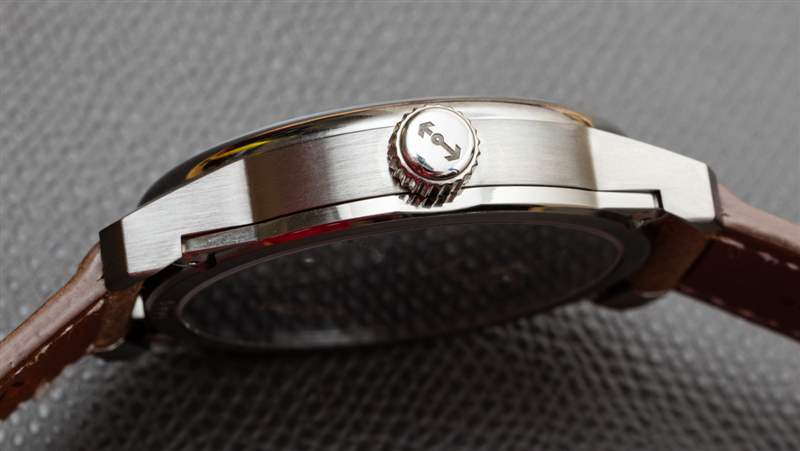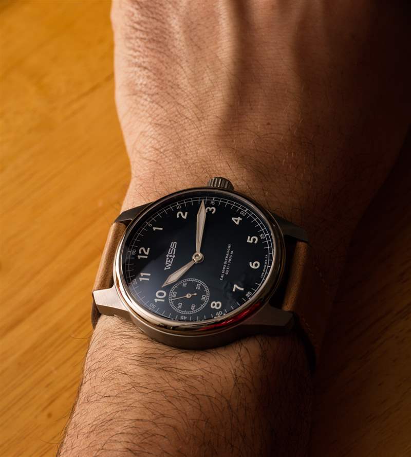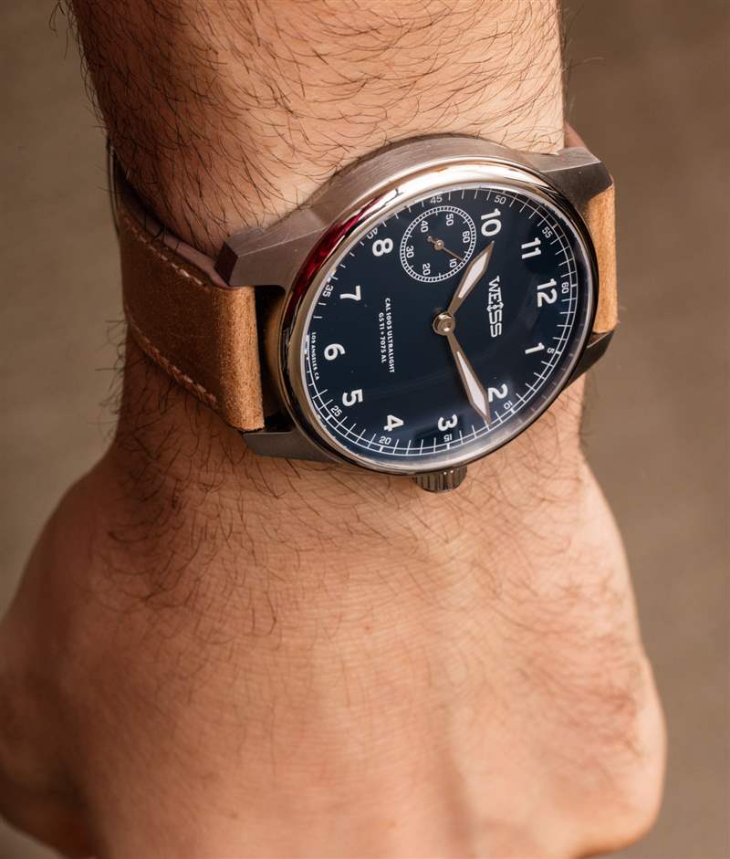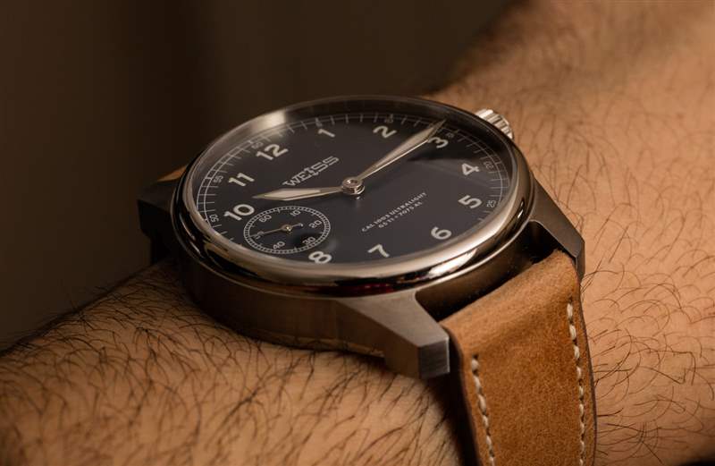 Weiss 與表殼相連,搭配一條 20 毫米寬的 Horween 皮革表帶,顏色為漂亮的蜂蜜色/棕褐色。表帶很舒適,與這個(gè)價(jià)位和款式的手表應(yīng)有的水平相當(dāng)。我要避免的是過(guò)于僵硬的肩帶——謝天謝地,這不是其中之一。