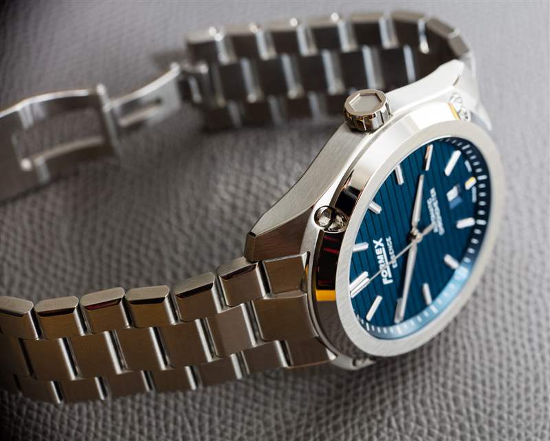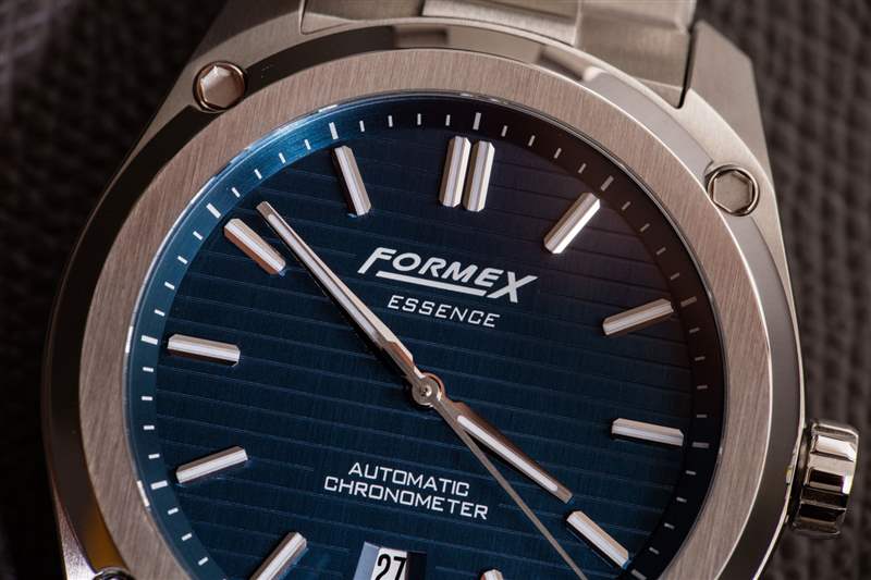 很難說 Essence 表盤的某些部分不是受到更現代的愛彼皇家橡樹和皇家橡樹離岸型腕表的啟發——即表盤、指針和時標等元素。無論如何,它們不是 1:1 的副本,但它們在主題上密切相關。這并沒有真正困擾我,因為從日期窗口的設計到指針和時標的比例,細節都差不多。藍色是一種可愛的表盤顏色,但 Formex 還提供其他色調的 Essence,例如銀色、棕色、灰色和退化灰色。