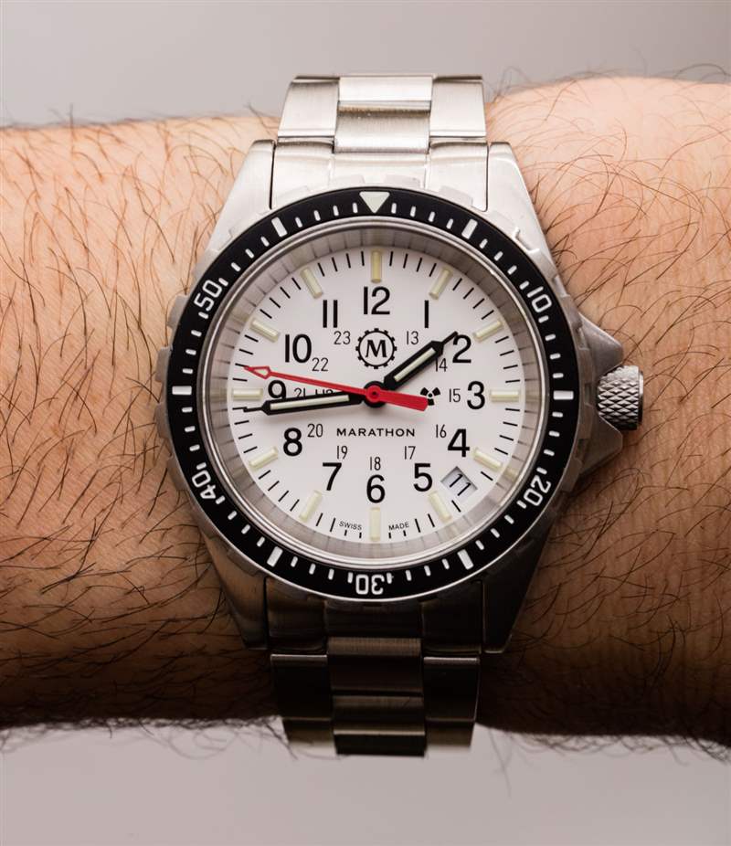 這是軍事供應(yīng)商和手表制造商馬拉松生產(chǎn)的第一款同類白表盤手表。我最近參觀了馬拉松在加拿大多倫多的總部,發(fā)現(xiàn)該公司的負(fù)責(zé)人正自豪地佩戴著這款手表的原型。“你知道,這是我們制作的第一個(gè)這樣的白色表盤,”第三代 Marathon 老板 Mitchel Wein 說(shuō)。Medium Diver’s Quartz(也常被稱為 TSAR,或“氚搜救表”)是 Marathon 生產(chǎn)的一款有趣且非常實(shí)用的“工具表”,它繼續(xù)為美國(guó)、英國(guó)、加拿大和其他軍隊(duì)提供時(shí)計(jì)軍隊(duì)。最近,Marathon 做出了一項(xiàng)重要決定,為其鐘表系列增添趣味,同時(shí)確保 Marathon 手表一如既往地耐用和實(shí)用。