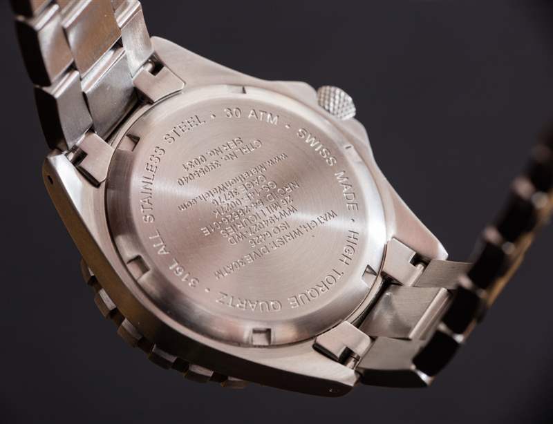 搭配相配的 316L 不銹鋼表鏈(您也可以在黑色橡膠表帶上購(gòu)買)也可以幫助手表呈現(xiàn)最佳外觀。雖然您可以在 Marathon Medium Diver 的 Quartz Ghostbuster 上放置任意數(shù)量的 18 毫米寬的表帶,但我認(rèn)為三連桿拉絲鋼表鏈看起來(lái)最帥氣。手鐲不僅具有迷人的錐形(重要的視覺(jué)觸感),而且還使用厚實(shí)的螺釘來(lái)固定鏈節(jié)。但是請(qǐng)注意,要確定手鐲的尺寸,您需要在螺絲的兩側(cè)使用螺絲刀——這意味著可能需要一些特殊工具。手鐲有一個(gè)折疊式展開式表扣,有點(diǎn)“上一代”,但可以完成工作。如果您需要將手表戴在大夾克或潛水服上,它還具有折疊式潛水員的延伸部分。