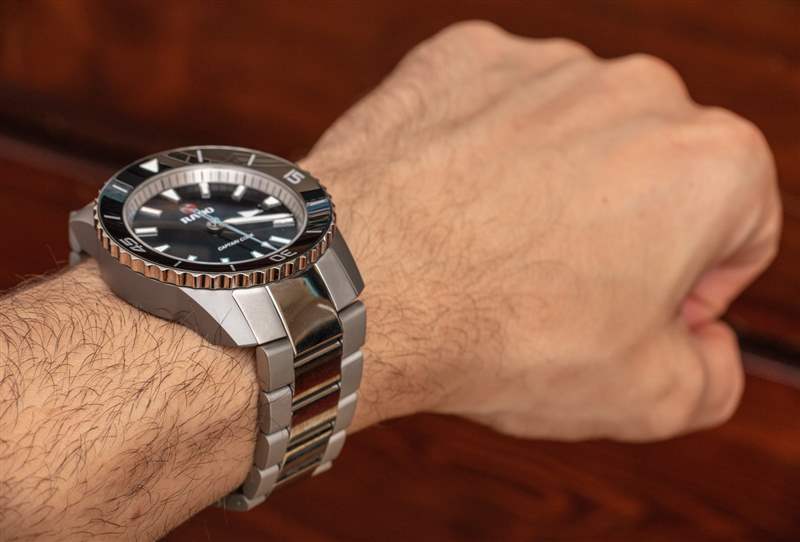 那個小眾受眾是誰?主要是手腕和手大到超大的手表愛好者。對于許多佩戴 Rado 庫克船長 45 毫米寬版本的佩戴者來說,主要問題將是時計的尺寸。表殼寬 45 毫米,厚近 14 毫米,表耳到表耳的距離接近 57 毫米。將其與主要表盤元素的卡通風格豐滿度相結合,您就擁有了一款大型鐘表,除此之外,在視覺上看起來就像一個大型鐘表。我很喜歡雷達提供的庫克船長鈦金屬,但我希望看到它有 42-43 毫米寬的尺寸。雷達表準備好為庫克船長自動腕表系列增添第四種風味了嗎?